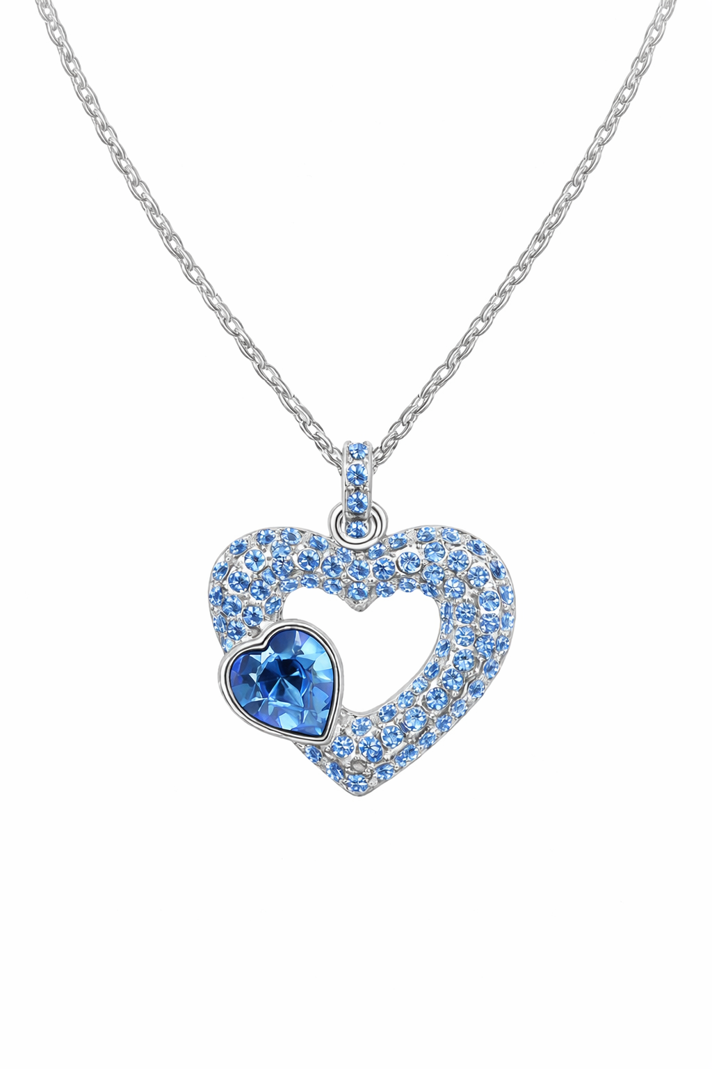 Dije con cadena en baño de oro banco de 18 quilates, diseño de corazón, con cristal azul en forma de corazón e incrustaciones de cristales azules. Fabricado en una estructura de aleación de platino con rodio sin níquel.