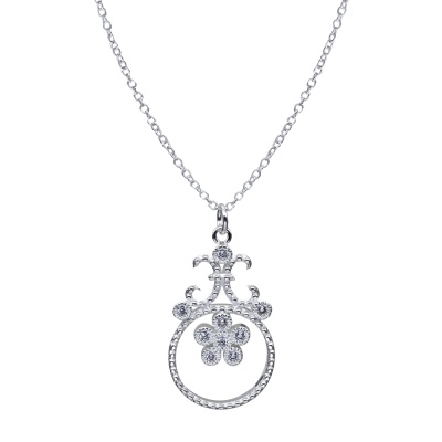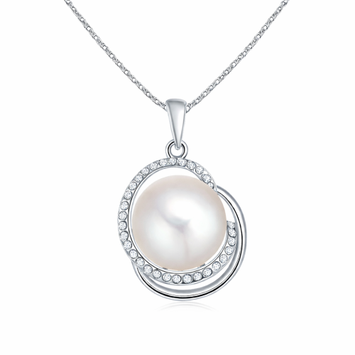 Dije con cadena en baño de oro blanco de 18 quilates, fino diseño con detalle de perla blanca e incrustaciones de cristales en color blanco. Fabricado en una estructura de aleación de platino con rodio sin níquel.