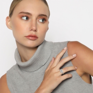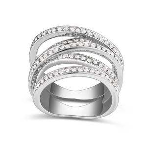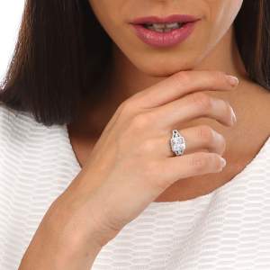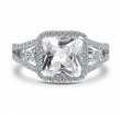 Precioso anillo en baño de oro blanco de 18 quilates, fino diseño, con cristal blanco corte cushion e incrustaciones de cristales blancos. Fabricado en una estructura de aleación de platino con rodio sin níquel.