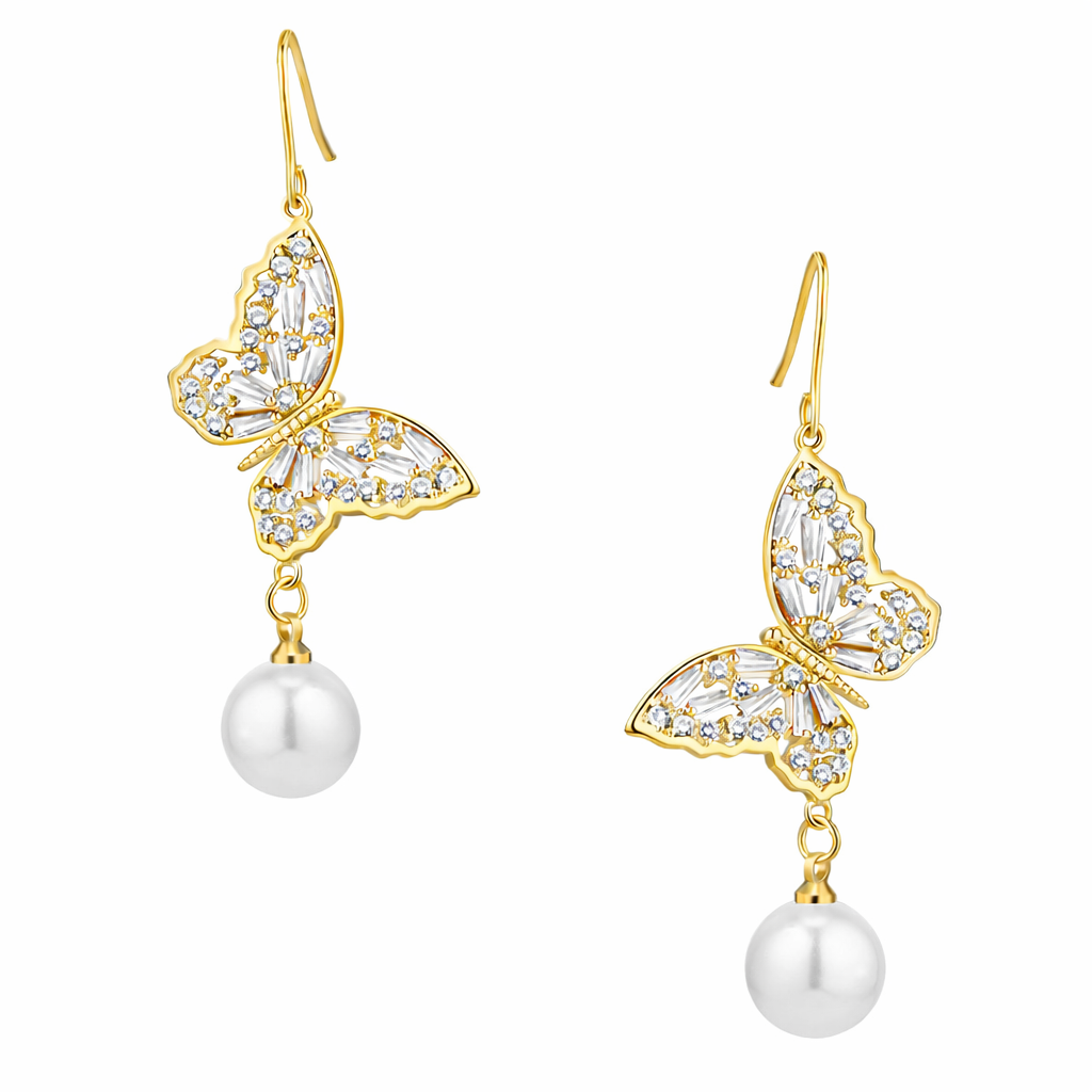 Bonitos aretes en baño de oro amarillo de 18 quilates , diseño de mariposas caladas, perla blanca, cristales blancos corte baguette e incrustaciones de cristales blancos.