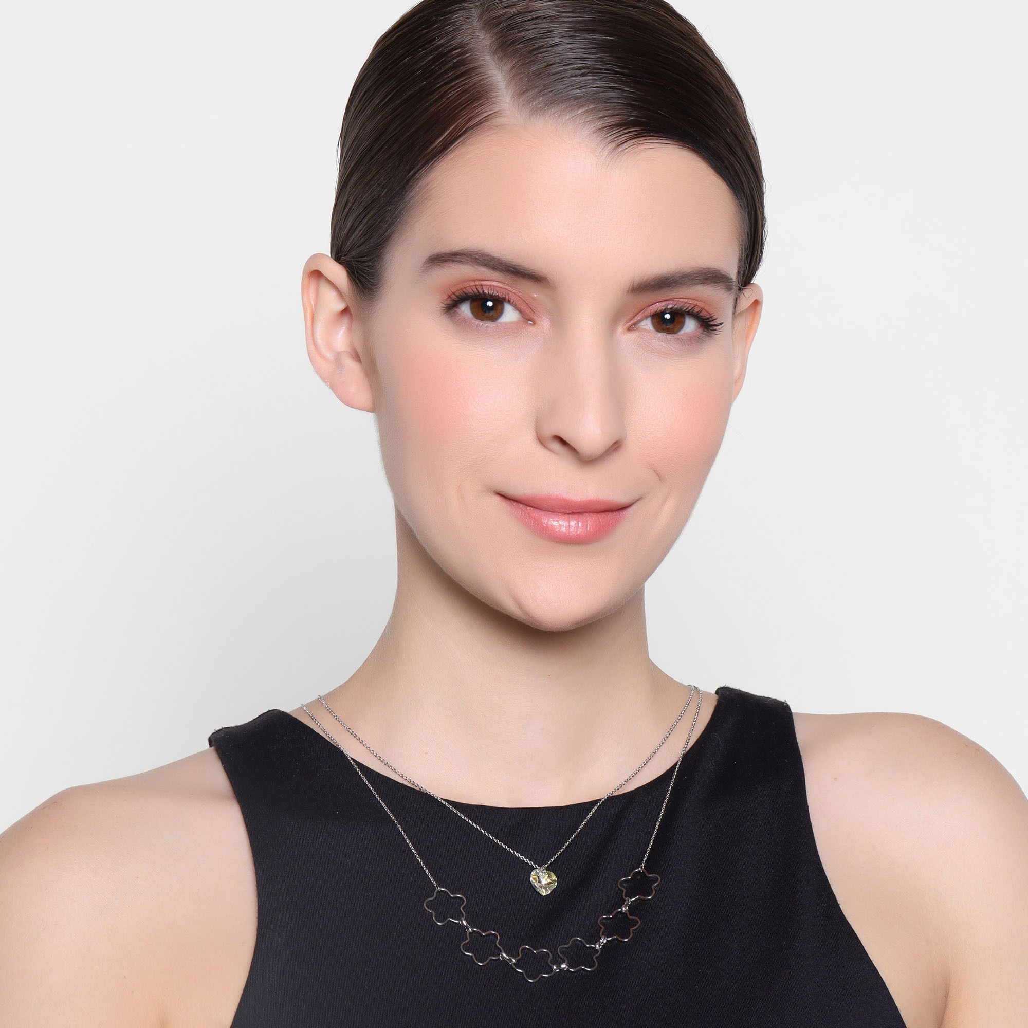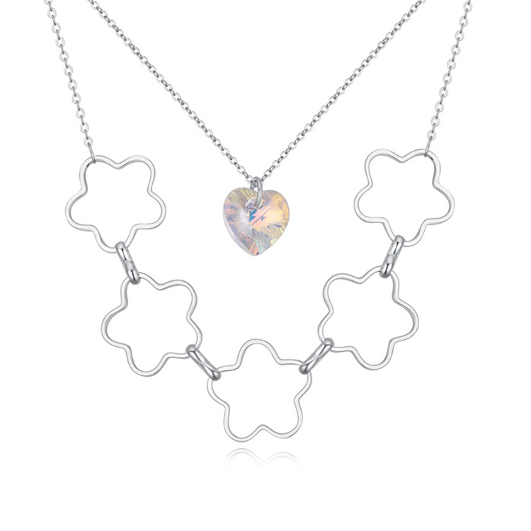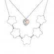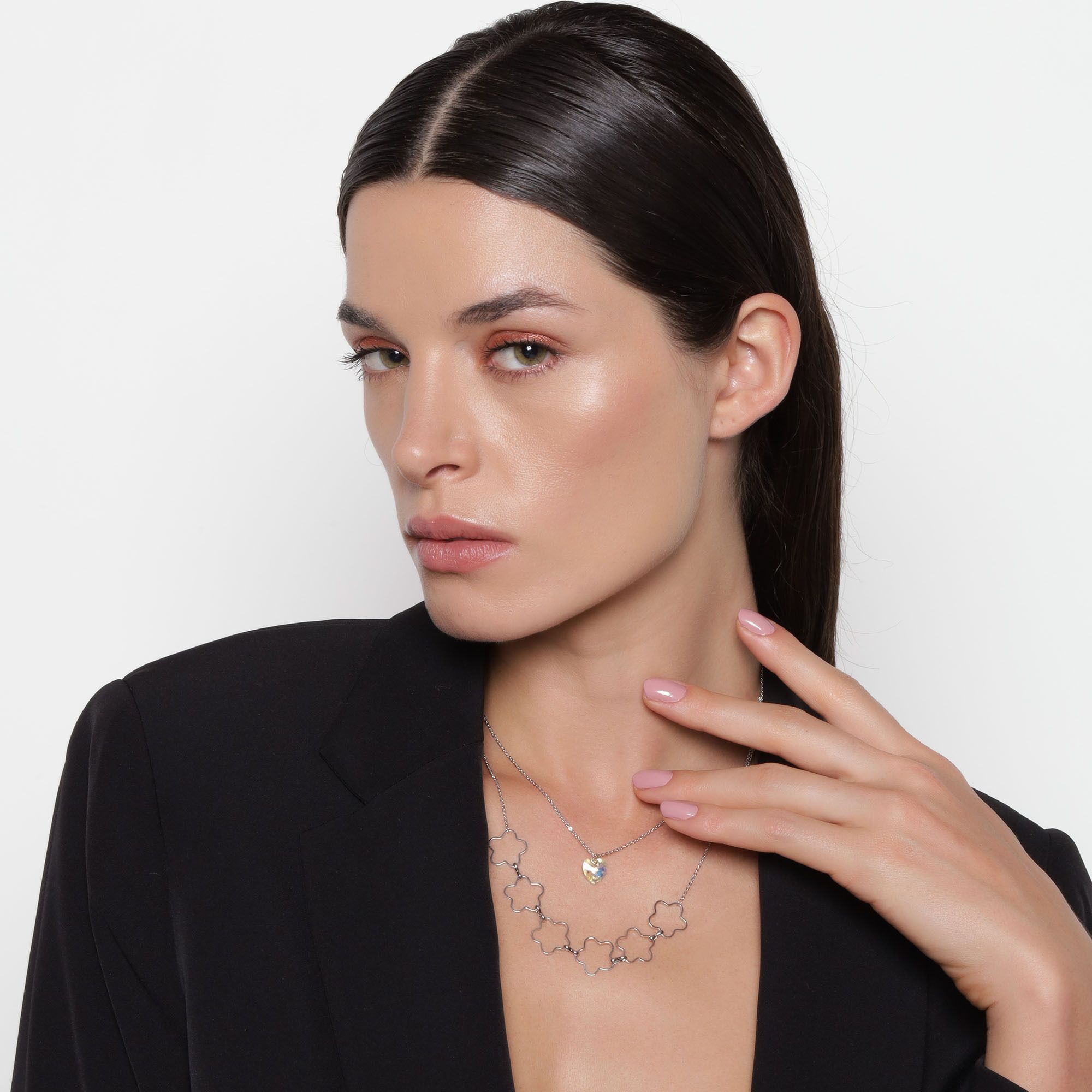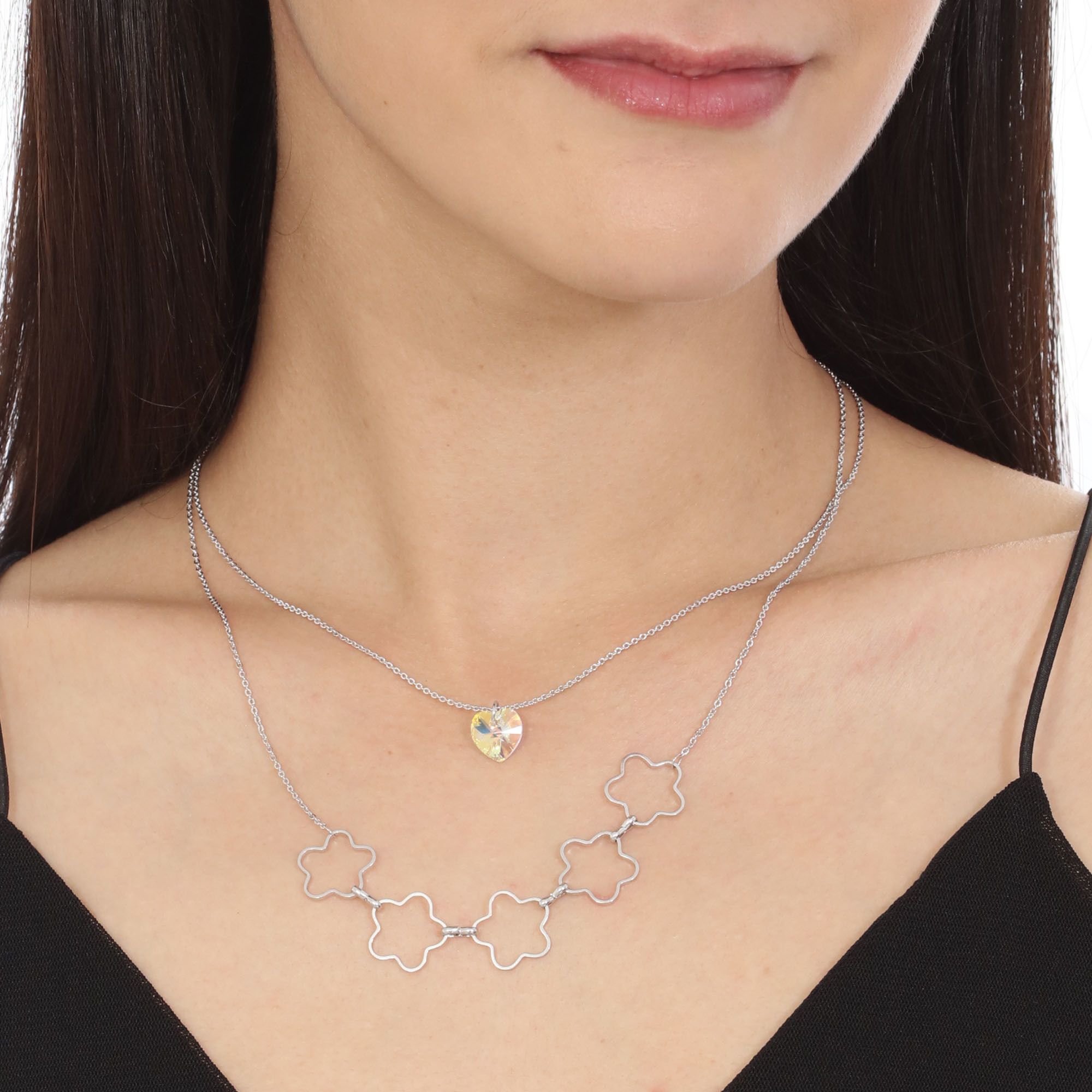 Precioso collar en baño de oro blanco de 18 quilates, diseño de flores con cristal corte corazón en color tornasol. Fabricado en una estructura de aleación de platino con rodio sin níquel.
