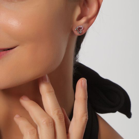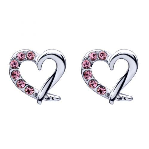 Hermosos aretes en baño de oro blanco de 18 quilates, diseño de corazón con incrustraciones de cristales en color rosa. Fabricado en una estructura de aleación de platino con rodio sin níquel.