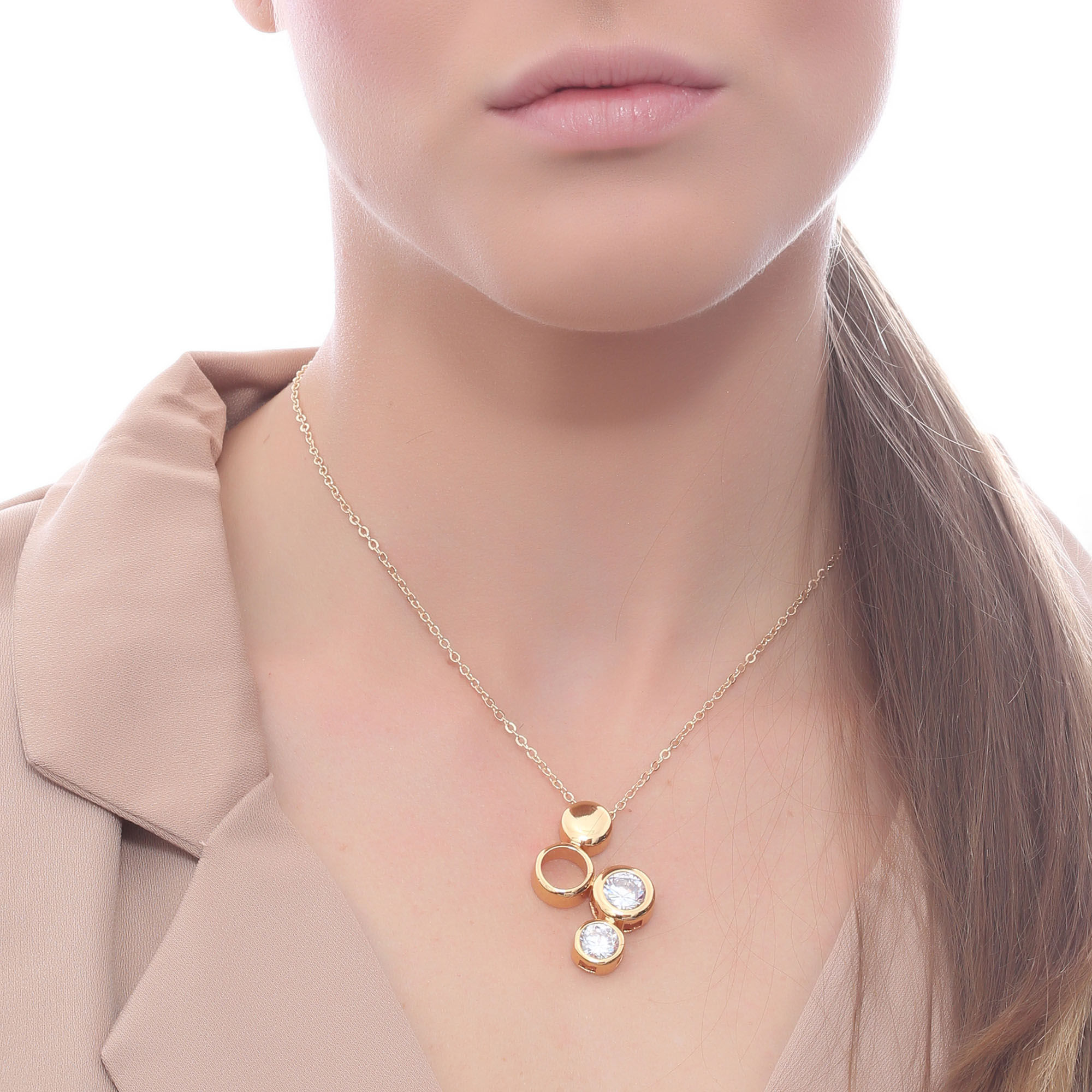 Lindo dije en baño de oro amarillo de 18 quilates, diseño de círculos con esmaltado blanco e incrustaciones de cristales en color blanco. Fabricado en una estructura de aleación de platino con rodio sin níquel.
