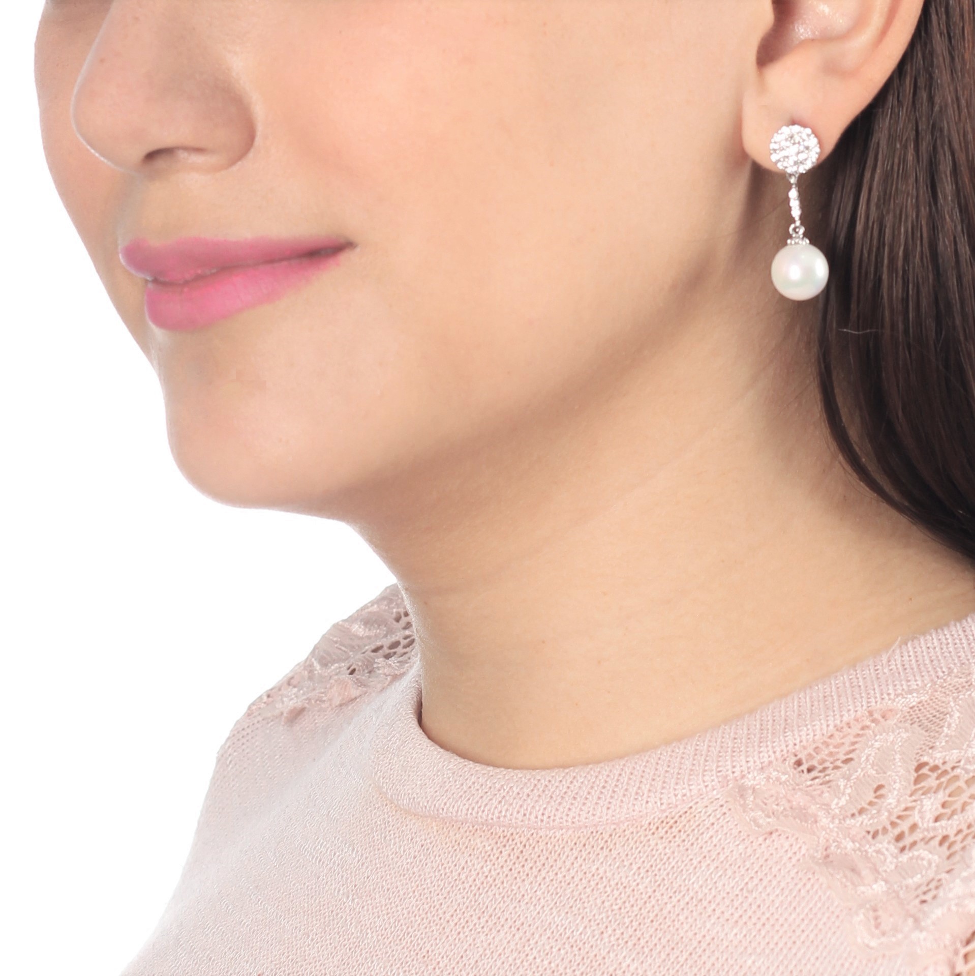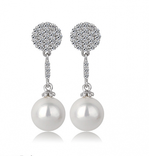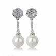 Hermosos aretes en baño de oro blanco de 18 quilates, con incrustaciones de cristales en color blanco y detalle de perla blanca. Fabricado en una estructura de aleación de platino con rodio sin níquel.