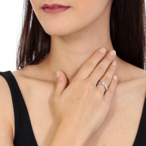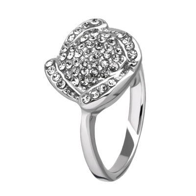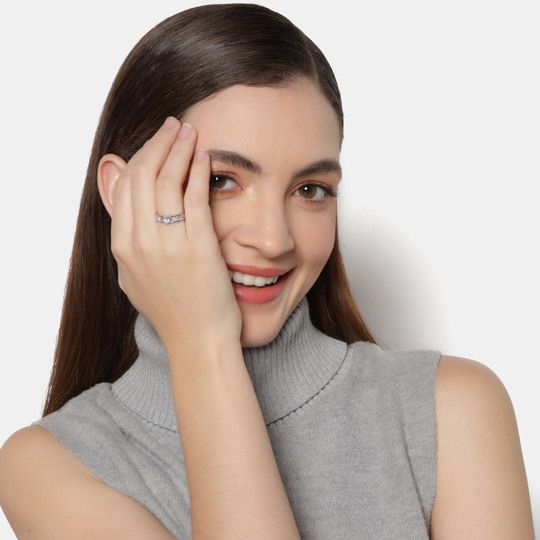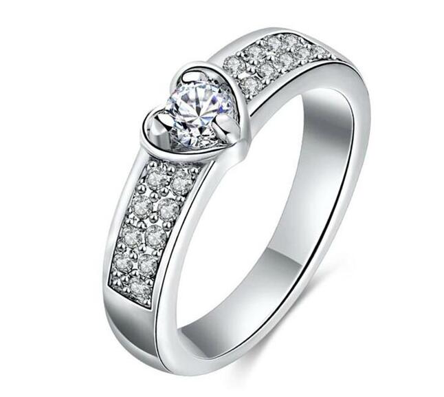 Anillo en baño de oro blanco de 18 quilates, diseño de corazón con incrustaciones de cristales en color blanco. Fabricado en una estructura de aleación de platino con rodio sin níquel.