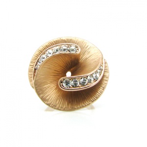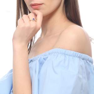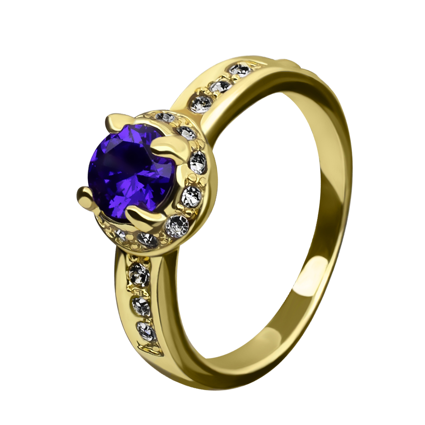 Lindo anillo en baño de oro amarillo de 18 quilates, fino diseño, con cristal morado corte brillante e incrustaciones de cristales blancos. Fabricado en una estructura de aleación de platino con rodio sin níquel.