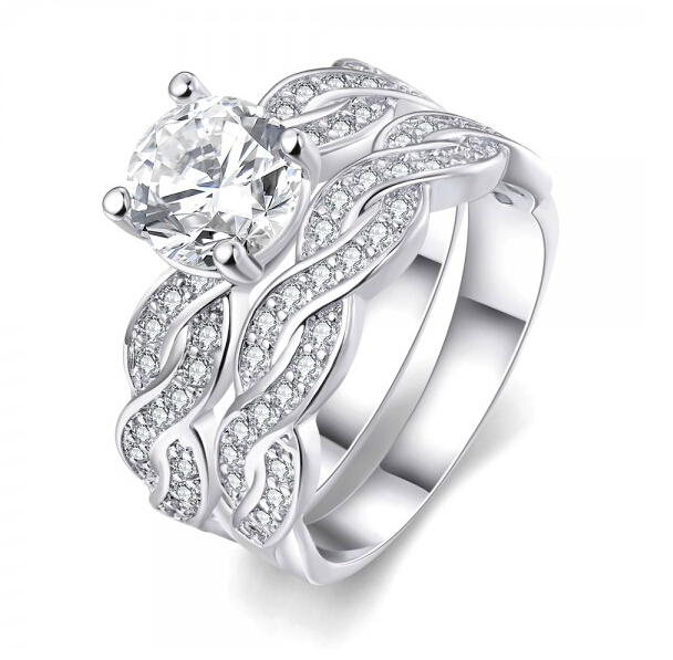 Precioso anillo doble, en baño de oro blanco de 18 quilates, fino diseño trenzado, con cristal aurora boreal corte brillante e incrustaciones de cristales color blanco. Fabricado en una estructura de aleación de platino con rodio sin níquel.