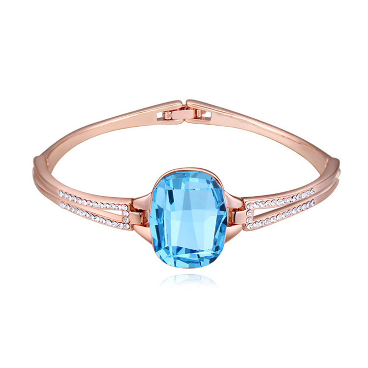 Lindo brazalete en baño de oro rosa de 18 quilates, fino diseño con incrustaciones de cristales en color azul y blanco. Fabricado en una estructura de aleación de platino con rodio sin níquel.