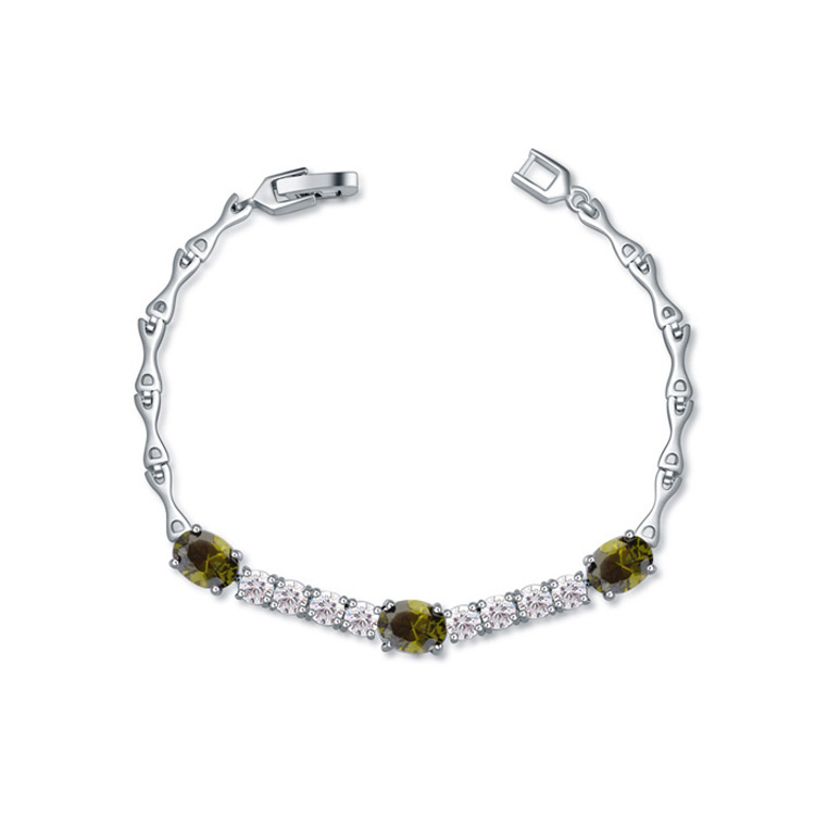 Hermoso brazalete en baño de oro blanco de 18 quilates, con incrustaciones de cristales en color verde y blanco. Fabricado en una estructura de aleación de platino con rodio sin níquel.