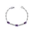 Hermoso brazalete en baño de oro blanco de 18 quilates, con incrustaciones de cristales en color morado y blanco. Fabricado en una estructura de aleación de platino con rodio sin níquel.