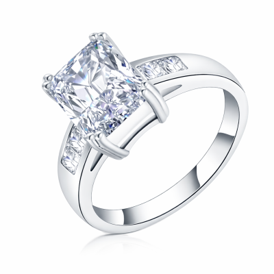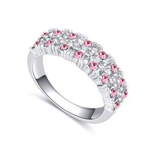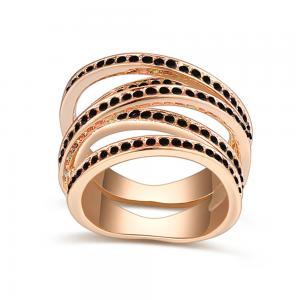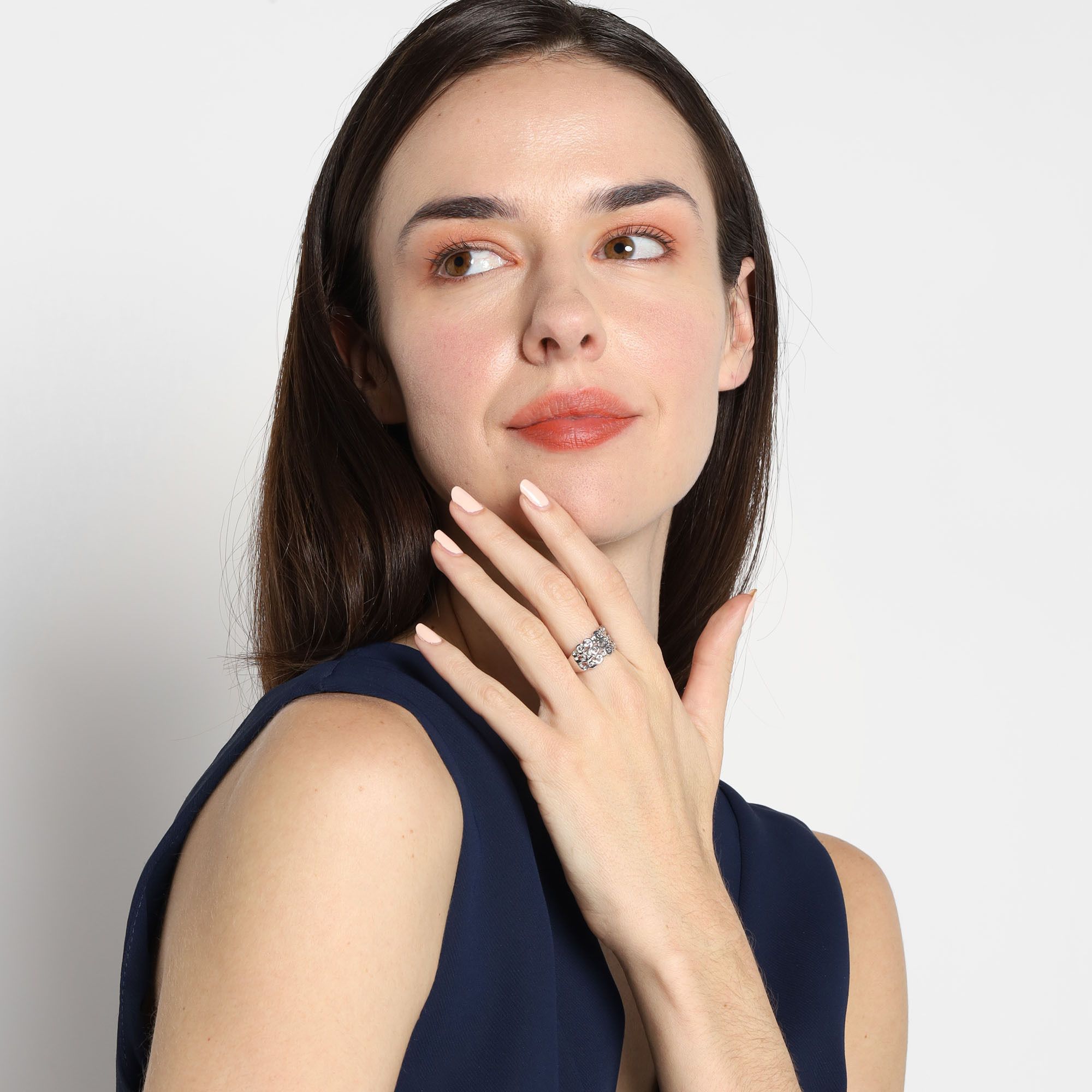 Elegante anillo, en baño de oro blanco de 18 quilates, elegante diseño con curvas caladas e incrustaciones de cristales en color blanco. Fabricado en una estructura de aleación de platino con rodio sin níquel.