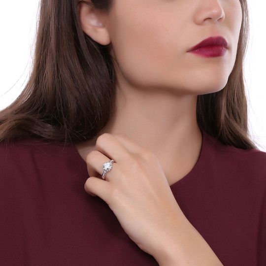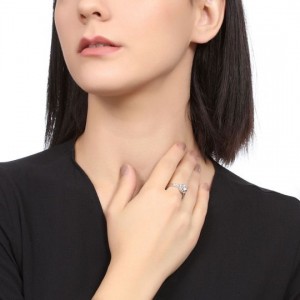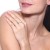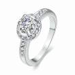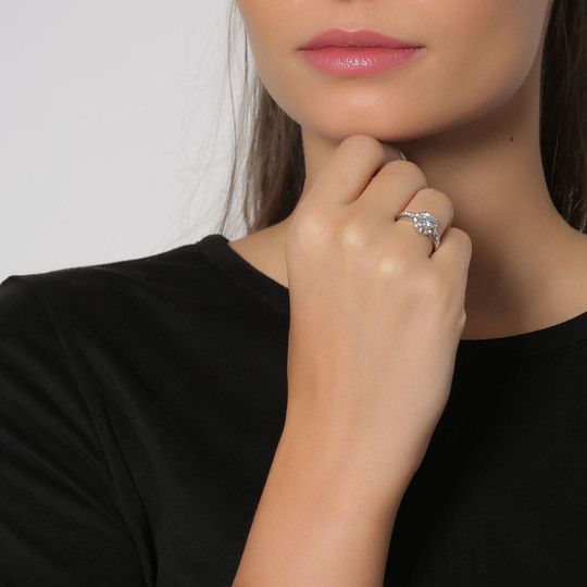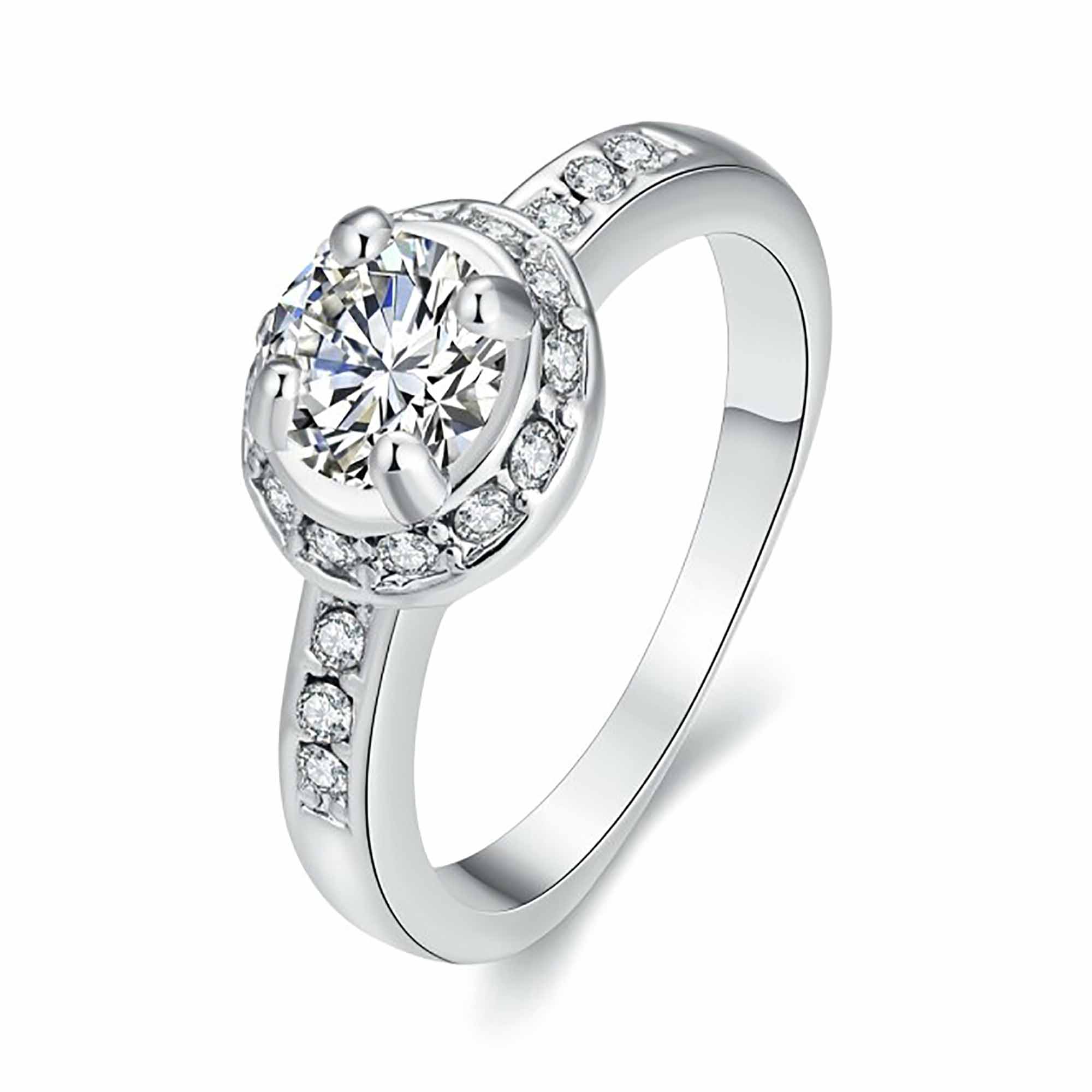 Delicado anillo en baño de oro blanco de 18 quilates, diseño de circulo con incrustación de cristales en color blanco.
