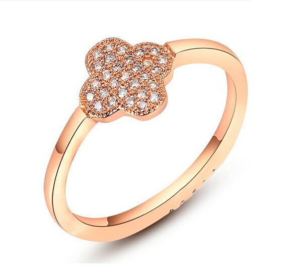 Delicado anillo en baño de oro rosa de 18 quilates, diseño de flor, con incrustación de cristales en color blanco.