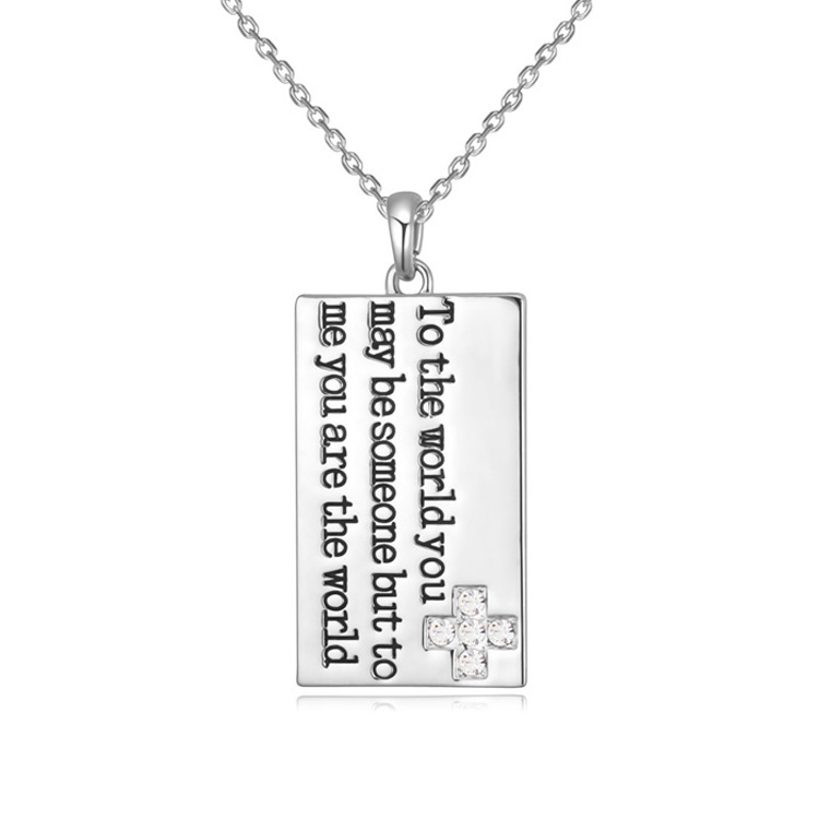 Lindo dije en baño de oro blanco de 18 quilates, con la leyenda "To the world you may be someone but to me you are the world" e incrustaciones de cristales en color blanco. Fabricado en una estructura de aleación de platino con rodio sin níquel.