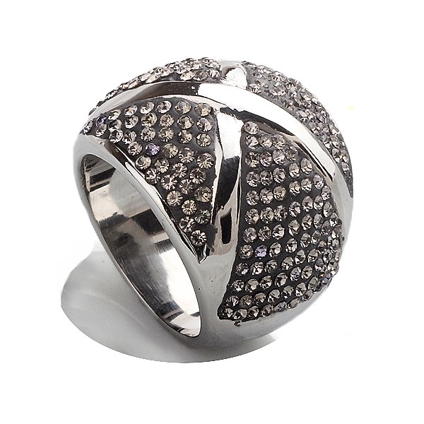 Elegante anillo en baño de oro blanco de 18 quilates, diseño en forma de "X" plateada con incrustación de cristales en color gris.