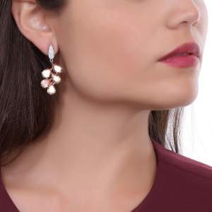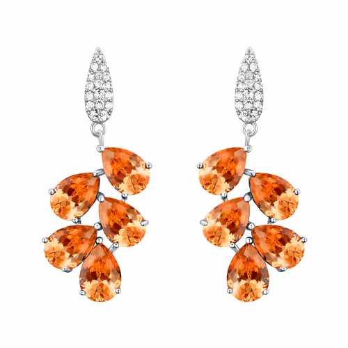 Hermosos aretes en baño de oro blanco de 18 quilates, diseño de hoja con incrustaciones de cristales en color ámbar y blanco. Fabricado en una estructura de aleación de platino con rodio sin níquel.