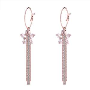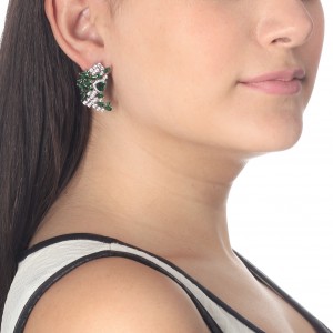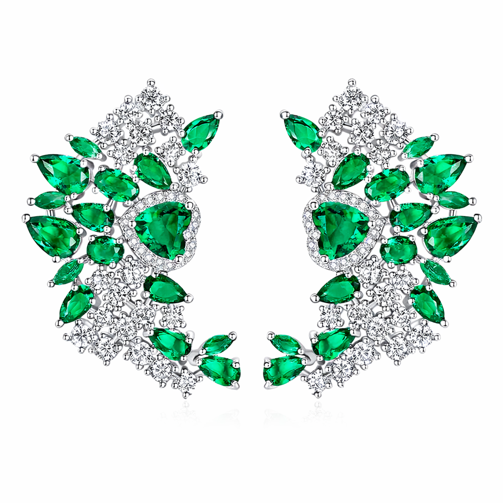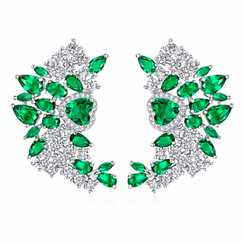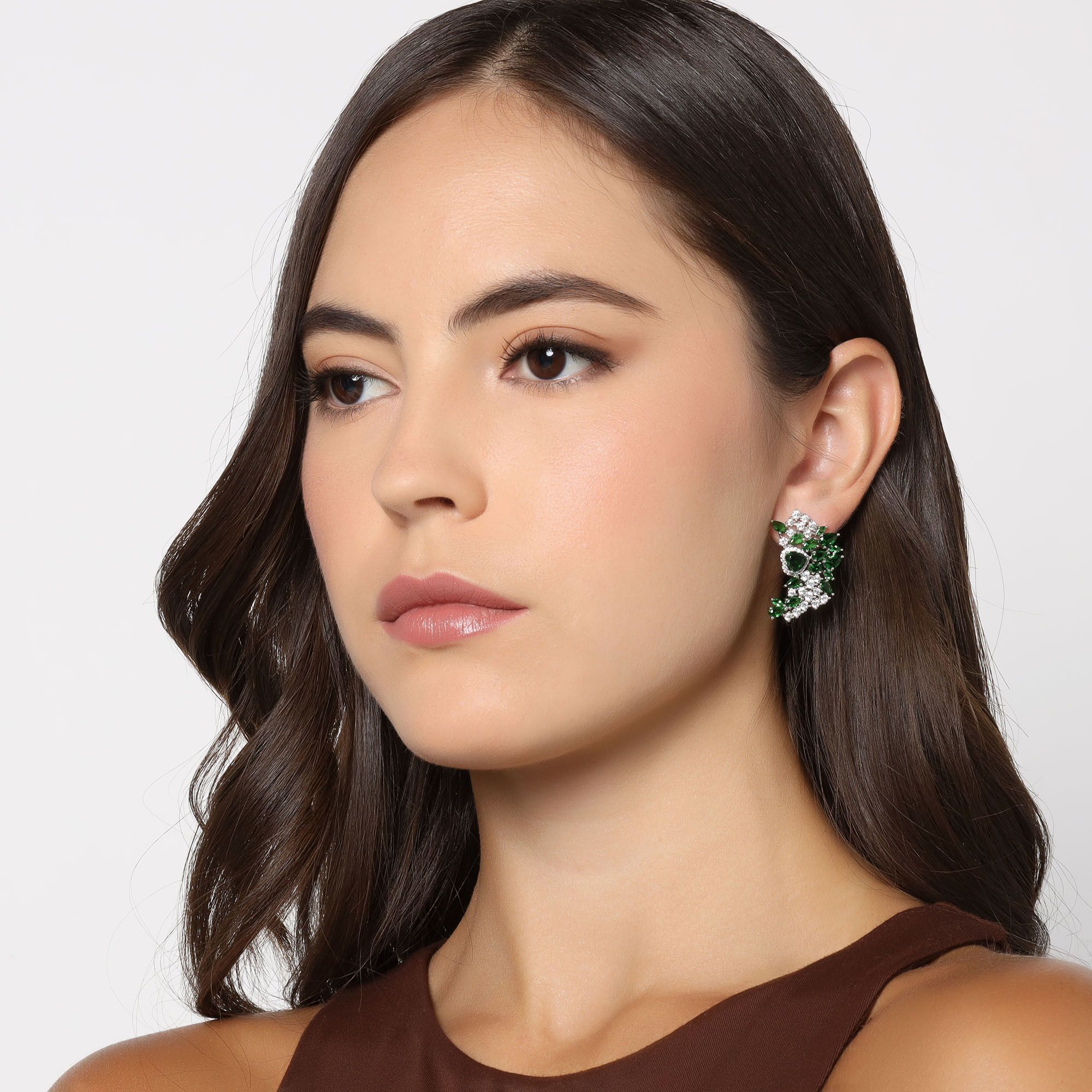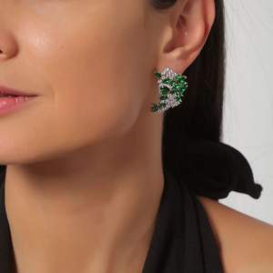 Finos aretes en baño de oro blanco de 18 quilates, exquisito diseño con cristales en color blanco y verde. Fabricado en una estructura de aleación de platino con rodio sin níquel.