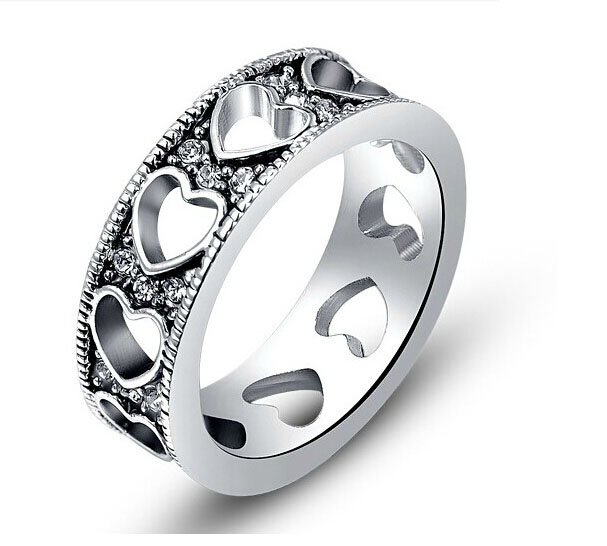 Precioso anillo en baño de oro blanco de 18 quilates, diseño de corazones calados, con incrustación de cristales color blanco.
