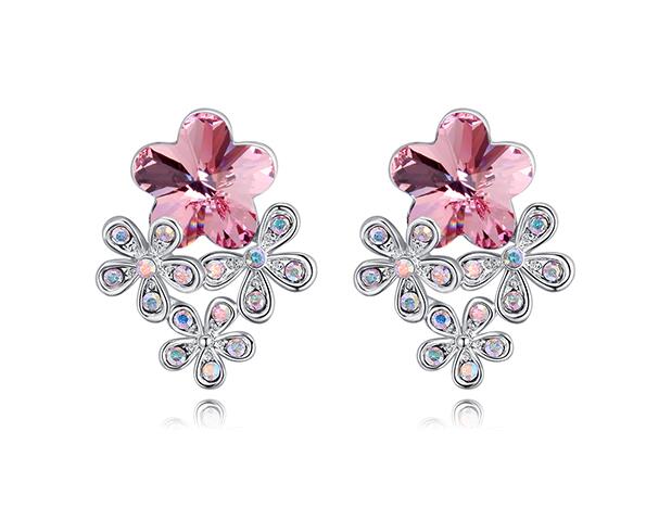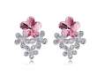 Lindos aretes en baño de oro blanco de 18 quilates, hermoso diseño de flores con incrustraciónes de cristales en color rosa y tornasol. Fabricado en una estructura de aleación de platino con rodio sin níquel.