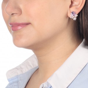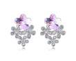 Lindos aretes en baño de oro blanco de 18 quilates, hermoso diseño de flores con incrustraciónes de cristales en color lila y tornasol. Fabricado en una estructura de aleación de platino con rodio sin níquel.