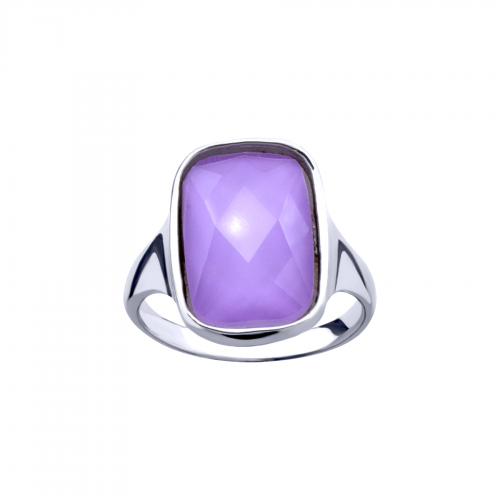 Precioso anillo en baño de oro blanco de 18 quilates, fino diseño con cristal facetado color lila, corte cushion.