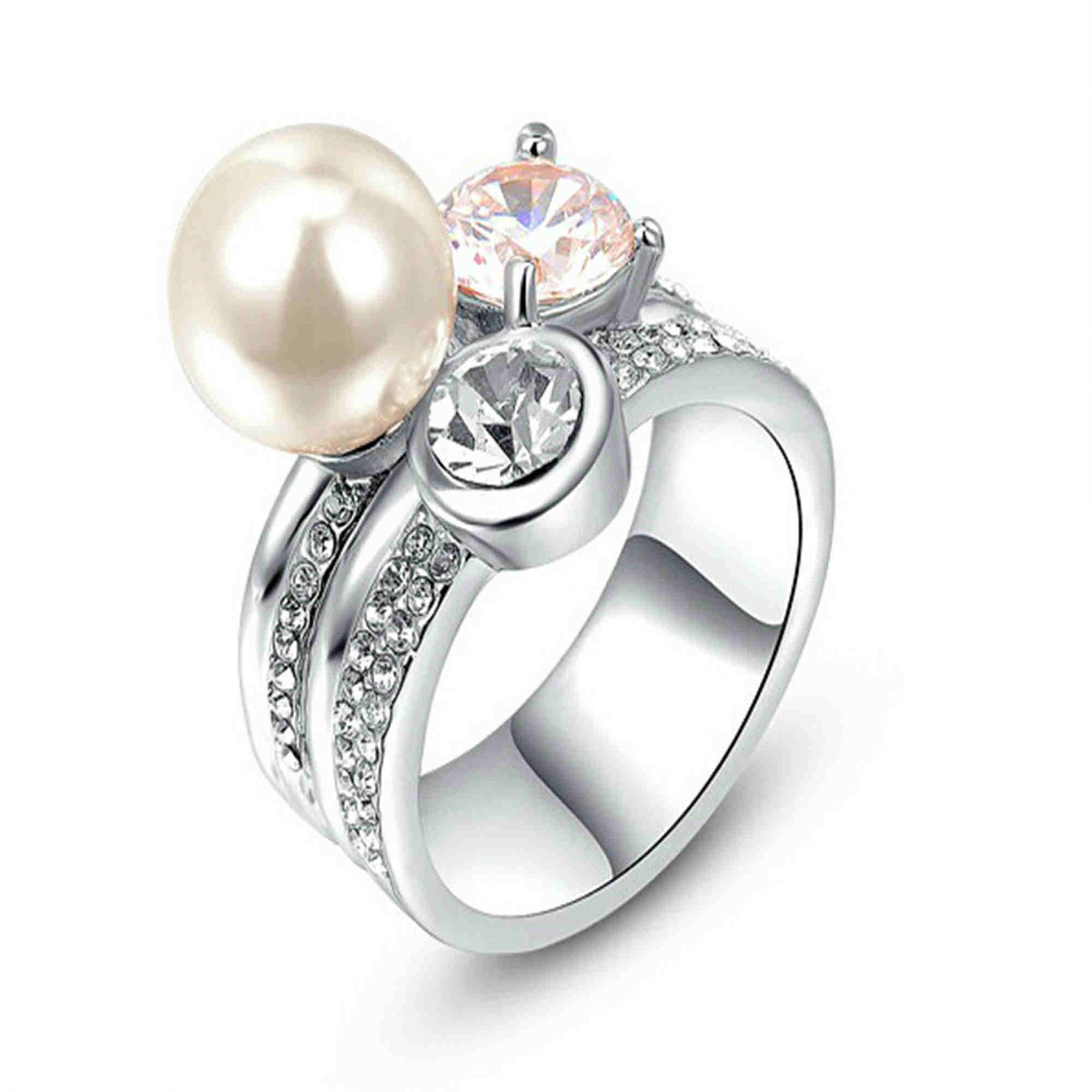 Delicado anillo en baño de oro blanco de 18 quilates, con detalle de perla blanca e incrustación de cristales en color blanco y ámbar.