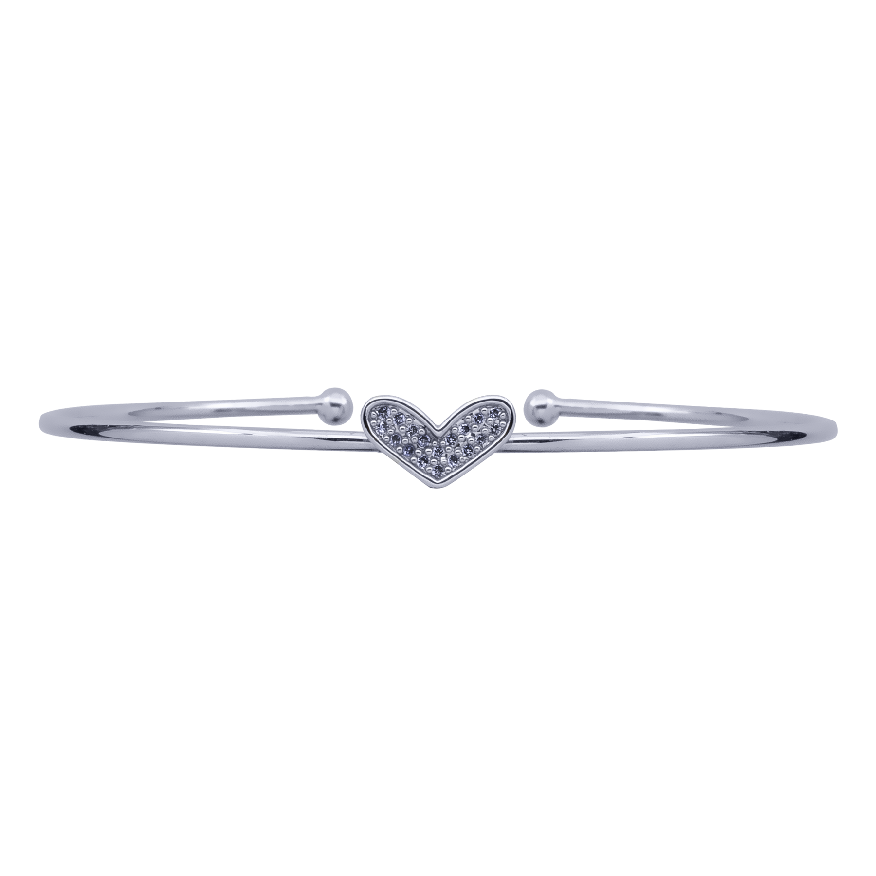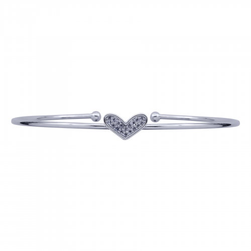 Fino brazalete en baño de oro blanco de 18 quilates, diseño de corazón con incrustaciones de cristales en color blanco. Fabricado en una estructura de aleación de platino con rodio sin níquel.