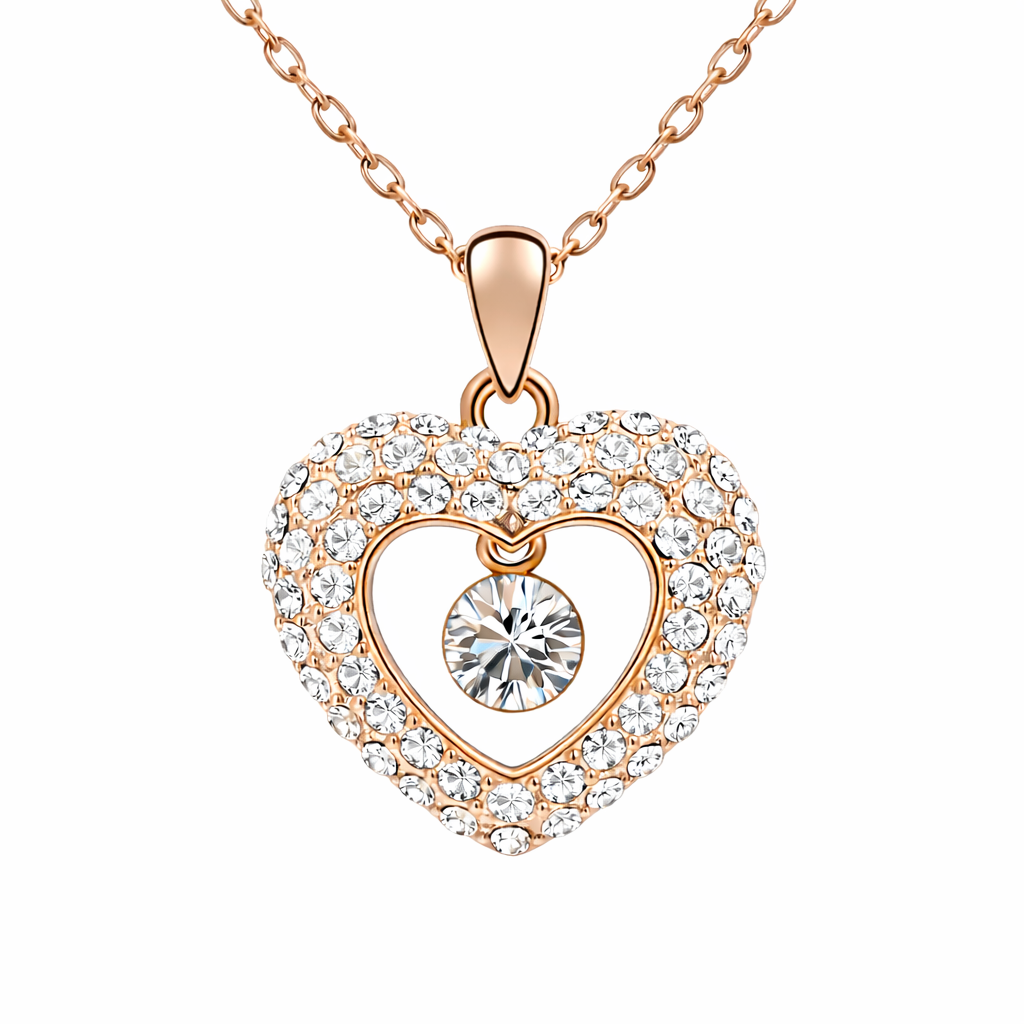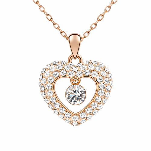 Hermoso collar en baño de oro rosa de 18 quilates, fino diseño de corazón con cristal blanco corte brillante e incrustaciones de cristales en color blanco. Fabricado en una estructura de aleación de platino con rodio sin níquel.