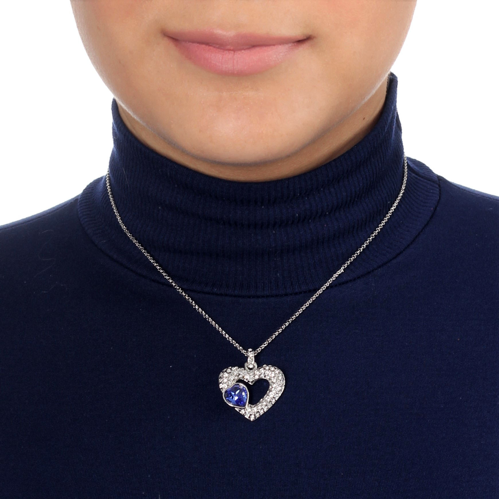 Dije con cadena en baño de oro banco de 18 quilates, diseño de corazón con incrustaciones de cristales en color azul y blanco. Fabricado en una estructura de aleación de platino con rodio sin níquel.