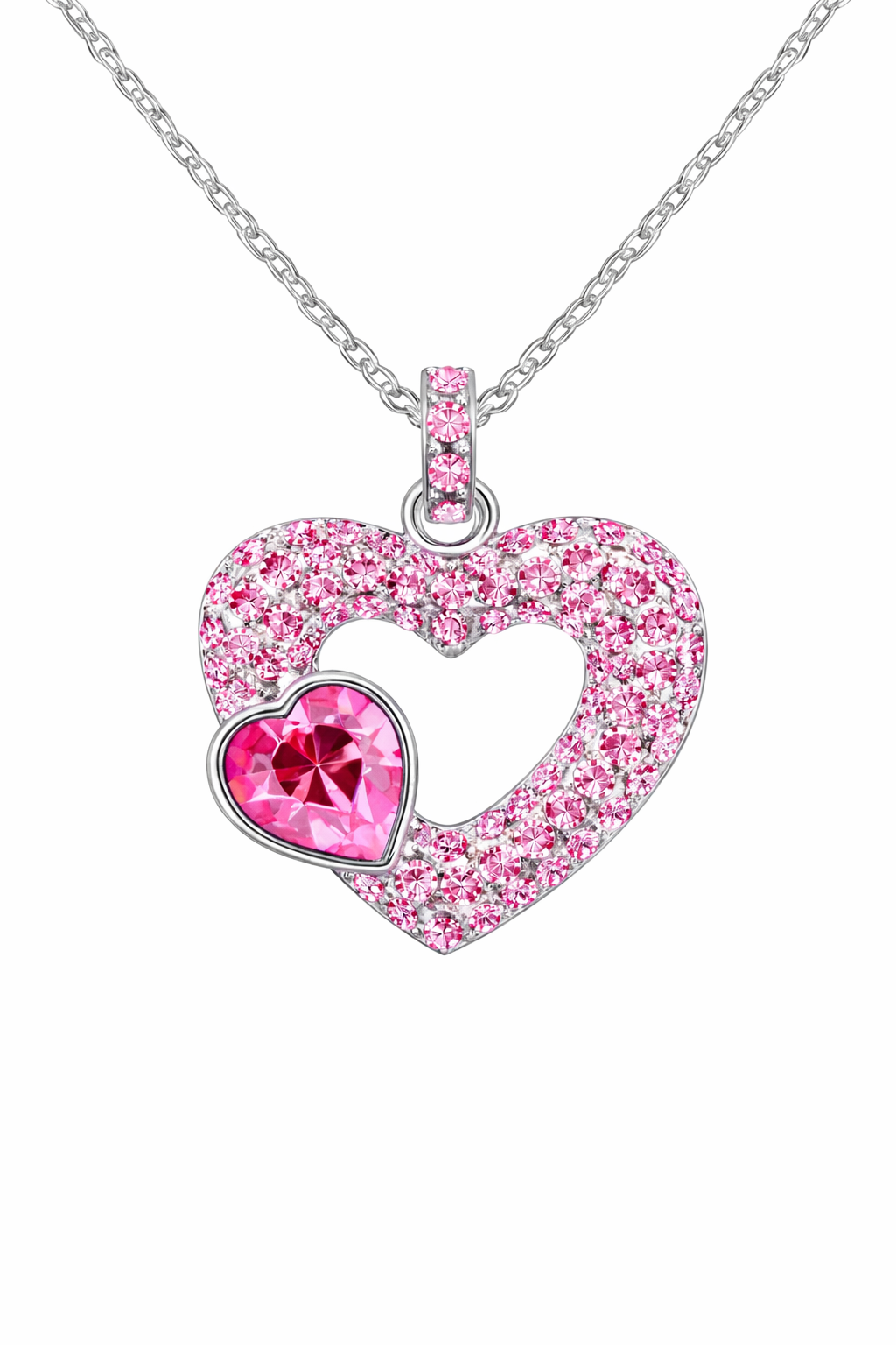 Dije con cadena en baño de oro banco de 18 quilates, diseño de corazón con cristal rosa en forma de corazón e incrustaciones de cristales rosas. Fabricado en una estructura de aleación de platino con rodio sin níquel.
