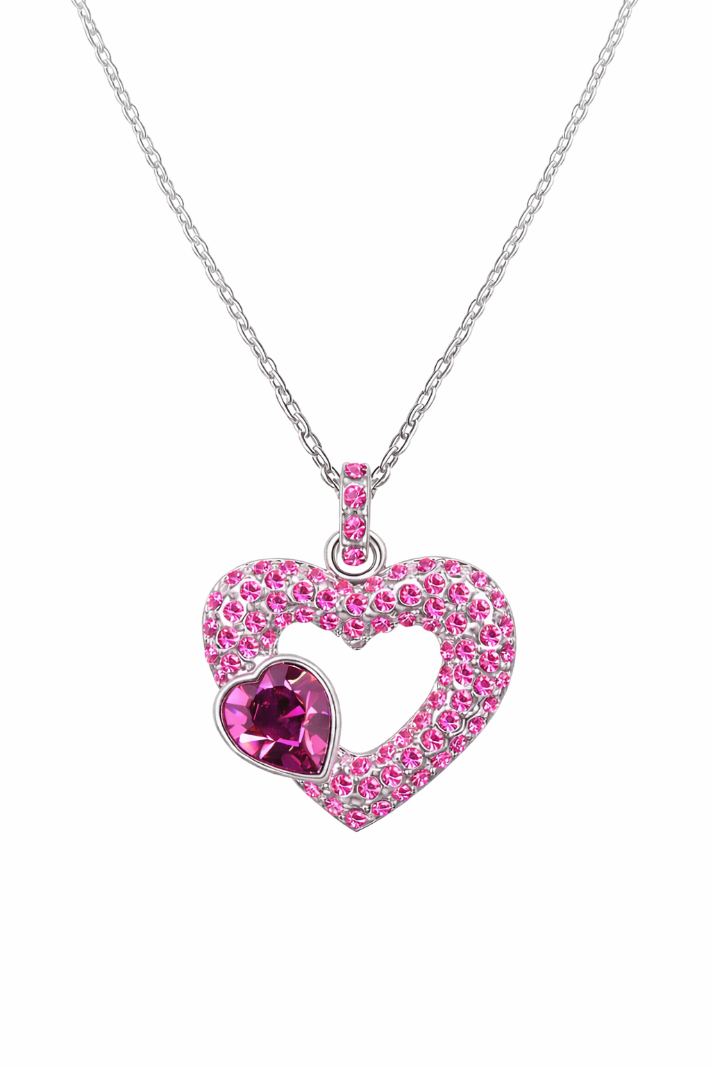 Dije con cadena en baño de oro banco de 18 quilates, diseño de corazón con cristal fucsia en forma de corazón e incrustaciones de cristales en color fucsia. Fabricado en una estructura de aleación de platino con rodio sin níquel.