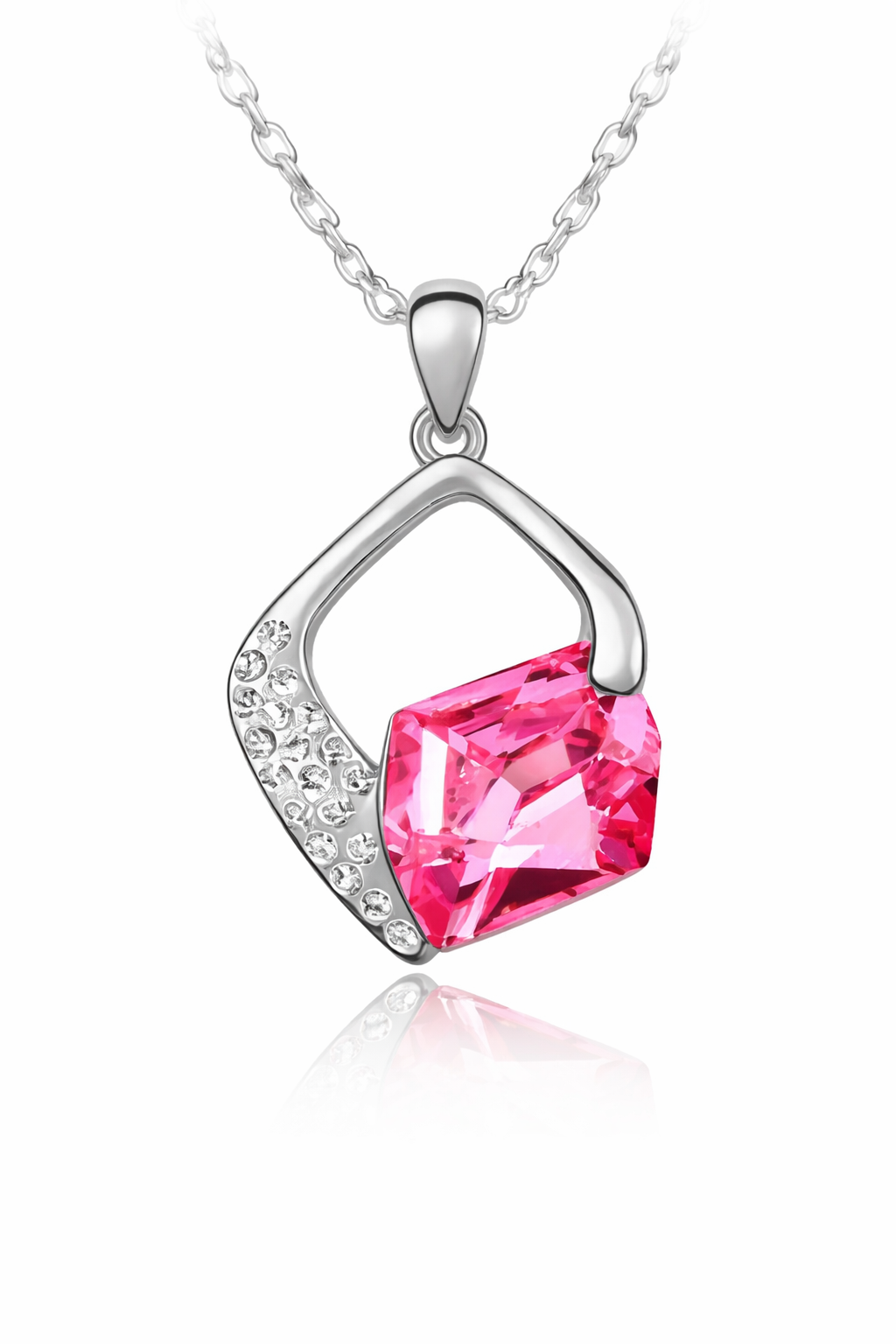 Dije con cadena en baño de oro blanco de 18 quilates, fino diseño con cristal rosa e incrustaciones de cristales en color blanco. Fabricado en una estructura de aleación de platino con rodio sin níquel.