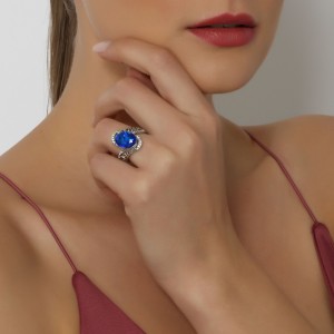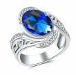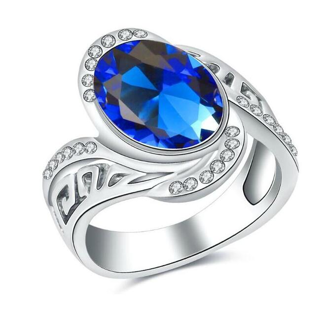Anillo en baño de oro blanco de 18 quilates, fino diseño entrelazado, con cristal azul corte oval e4 incrustaciones de cristales blancos. Fabricado en una estructura de aleación de platino con rodio sin níquel.