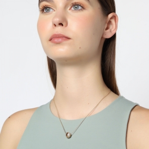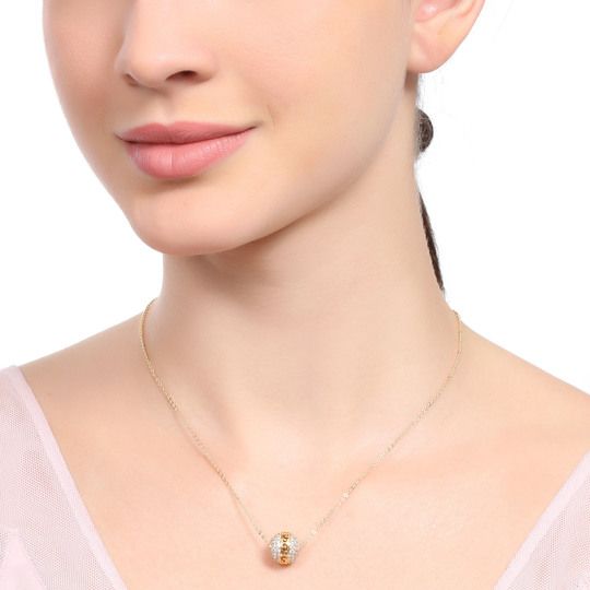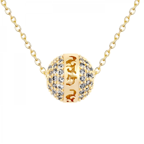 Exquisito dije en baño de oro amarillo de 18 quilates, diseño de esfera con calado e incrustaciones de cristales en color blanco. Fabricado en una estructura de aleación de platino con rodio sin níquel.