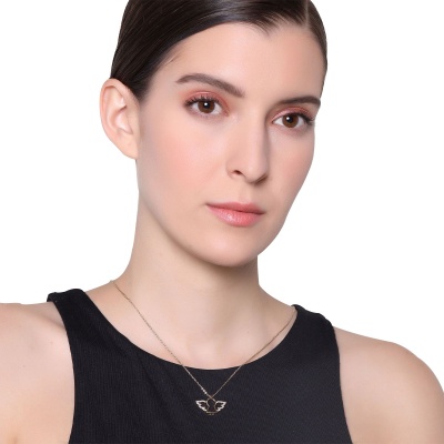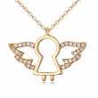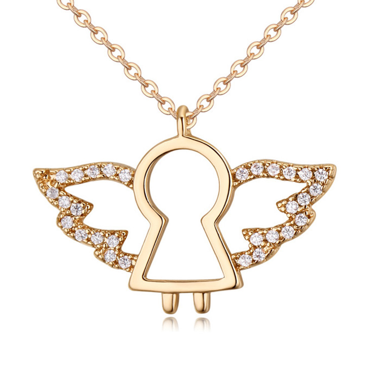 Dije con cadena en baño de oro amarillo de 18 quilates, diseño de ángel con incrustaciones de cristales en color blanco. Fabricado en una estructura de aleación de platino con rodio sin níquel.