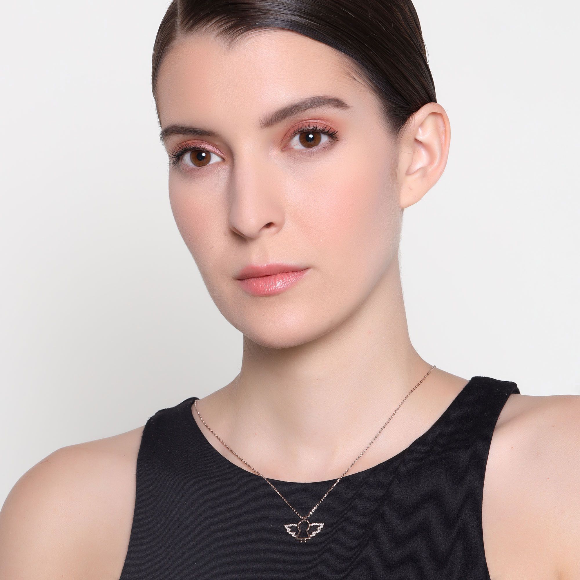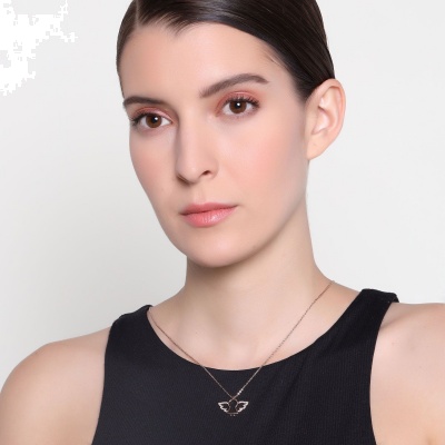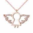 Dije con cadena en baño de oro rosa de 18 quilates, diseño de ángel con incrustaciones de cristales en color blanco. Fabricado en una estructura de aleación de platino con rodio sin níquel.