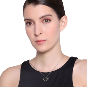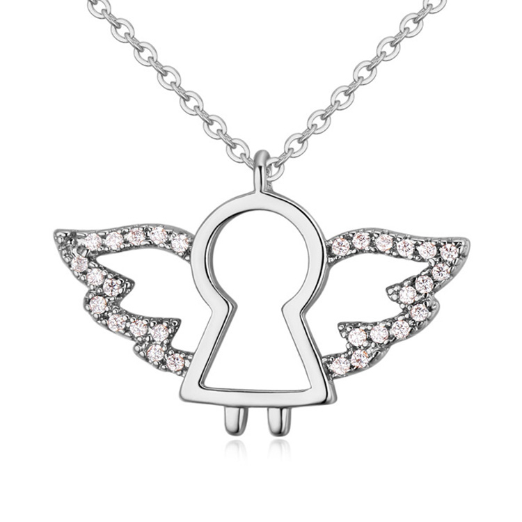 Dije con cadena en baño de oro blanco de 18 quilates, diseño de ángel con incrustaciones de cristales en color blanco. Fabricado en una estructura de aleación de platino con rodio sin níquel.