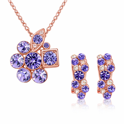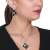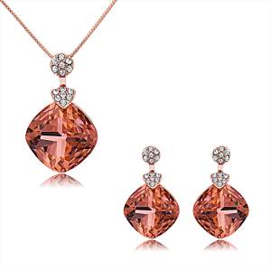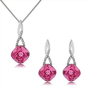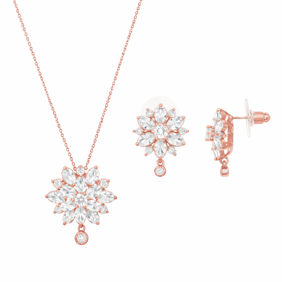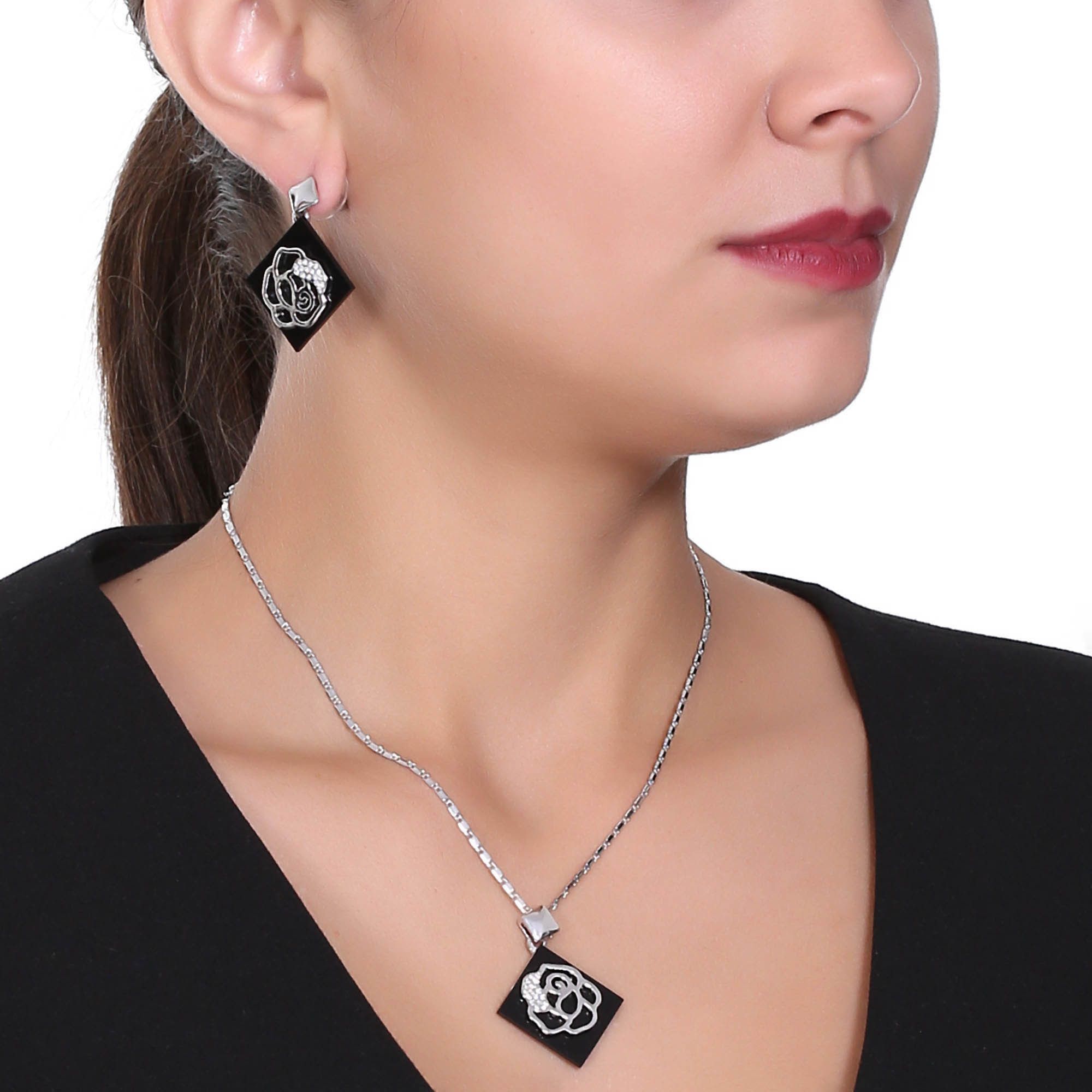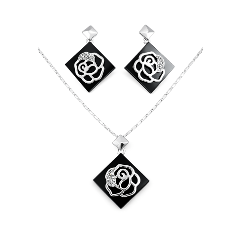 Lindo conjunto de aretes y dije en baño de oro blanco de 18 quilates, con diseño de rombos en color negro y hermoso grabado de rosas plateadas con incrustaciones de cristales blancos. Fabricado en una estructura de aleación de platino con rodio sin níquel.