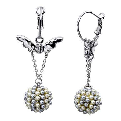 Preciosos pendientes en baño de oro blanco de 18 quilates con detalle plateado en forma de alas, perlas e incrustaciones de cristales blancos. Fabricado en una estructura de aleación de platino con rodio sin níquel.
