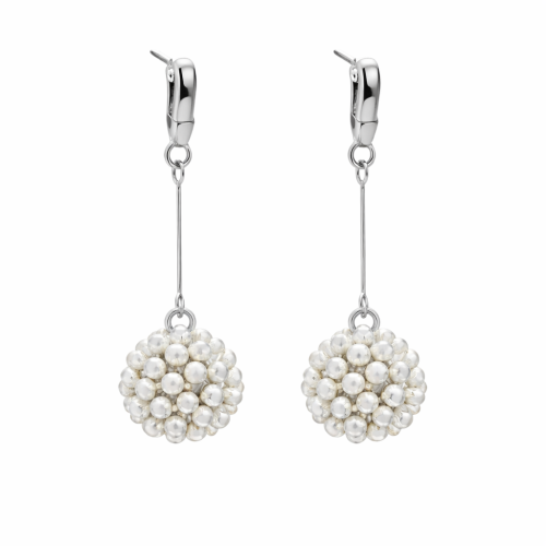 Originales pendientes en baño de oro blanco de 18 quilates, esfera con perlas e incrustaciones de cristales blancos. Fabricado en una estructura de aleación de platino con rodio sin níquel.