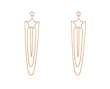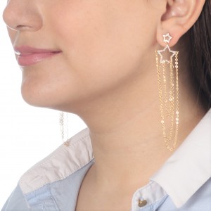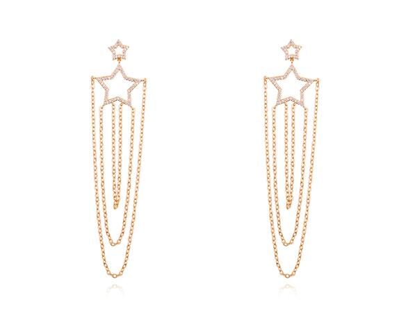 Hermosos aretes en baño de oro amarillo de 18 quilates, lindo diseño de estrellas con cadenas e incrustración de cristales en color blanco. Fabricado en una estructura de aleación de platino con rodio sin níquel.