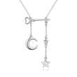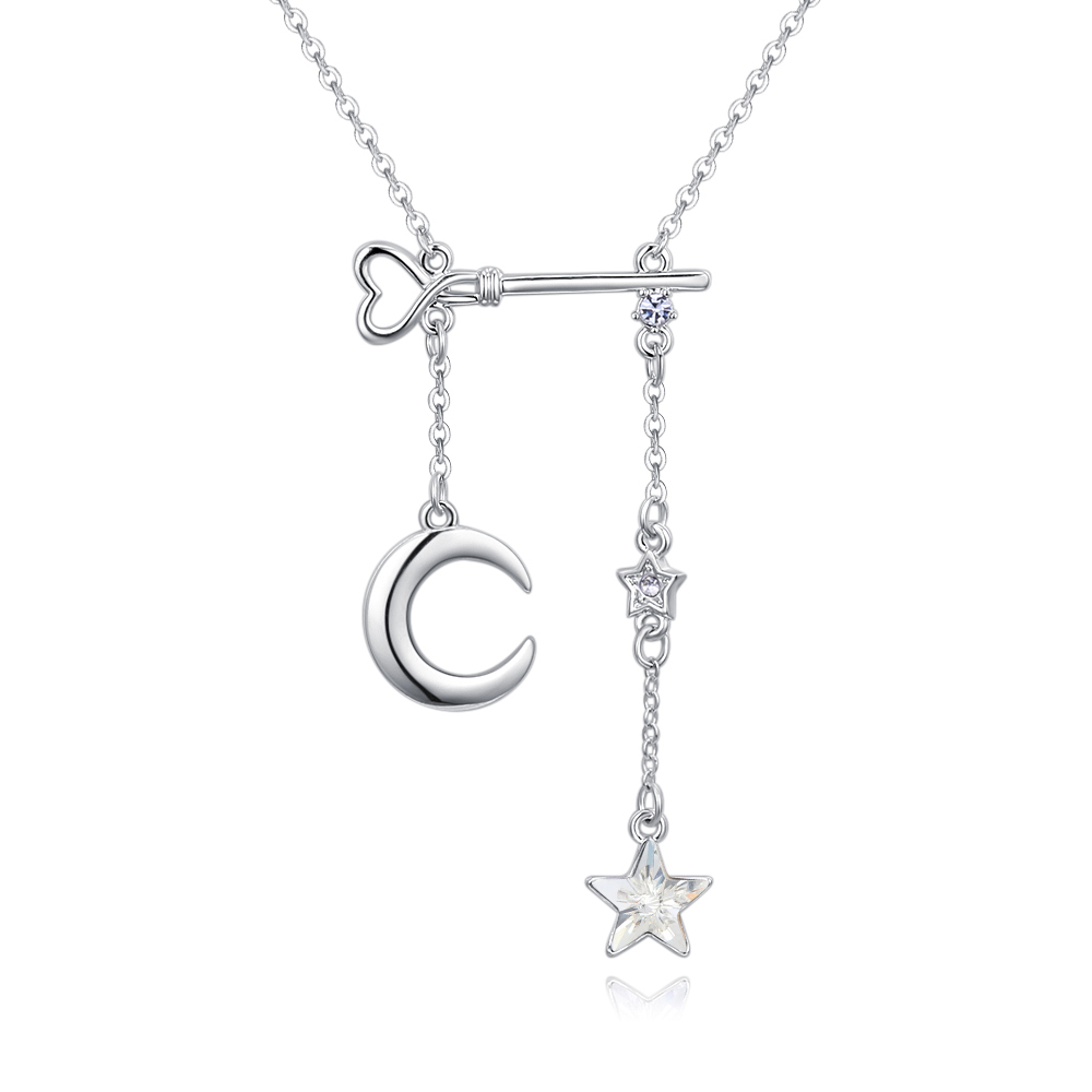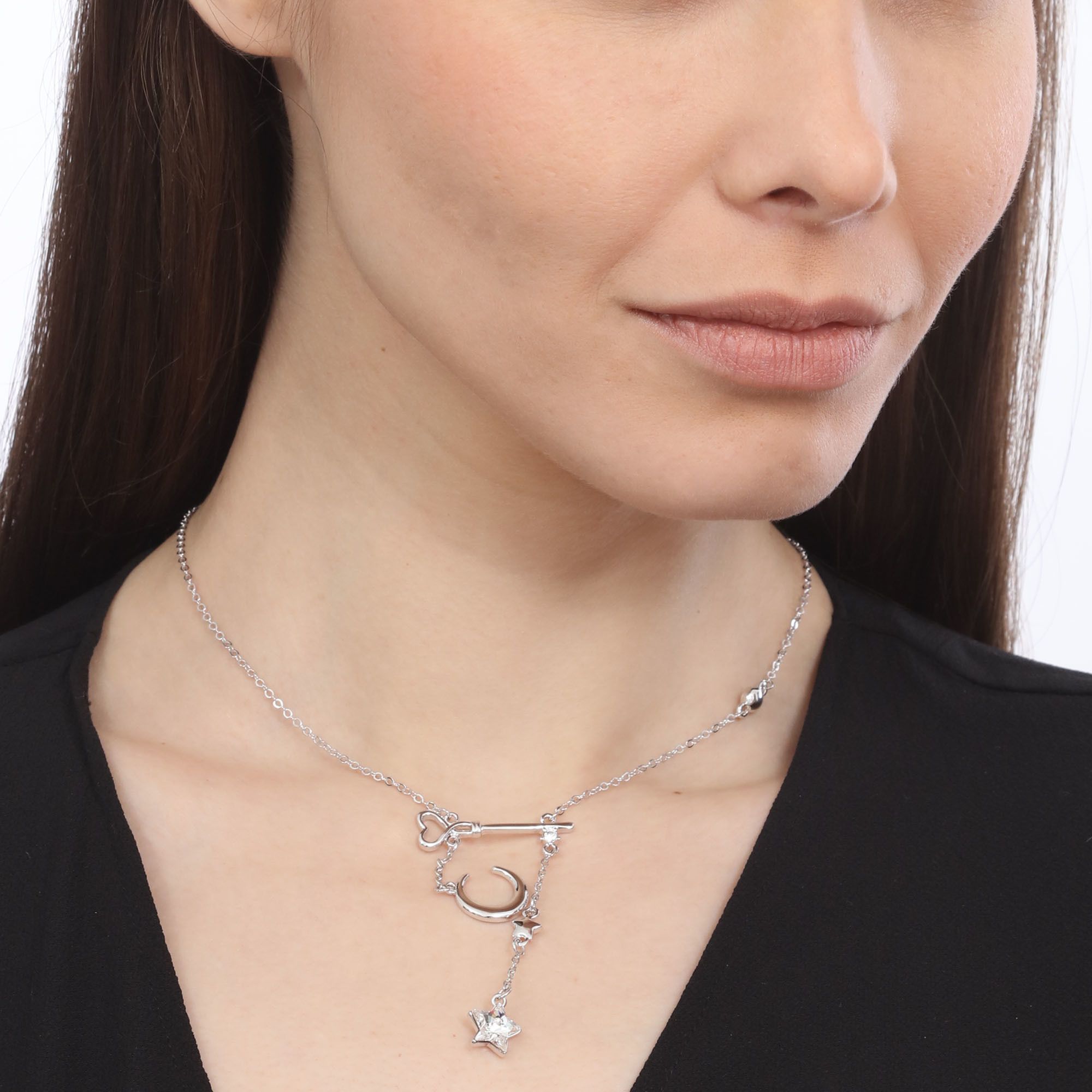 Hermoso collar en baño de oro blanco de 18 quilates, diseño de media luna, estrella y una pequeña llave que las sostiene, con incrustaciones de cristales en color blanco. Fabricado en una estructura de aleación de platino con rodio sin níquel.