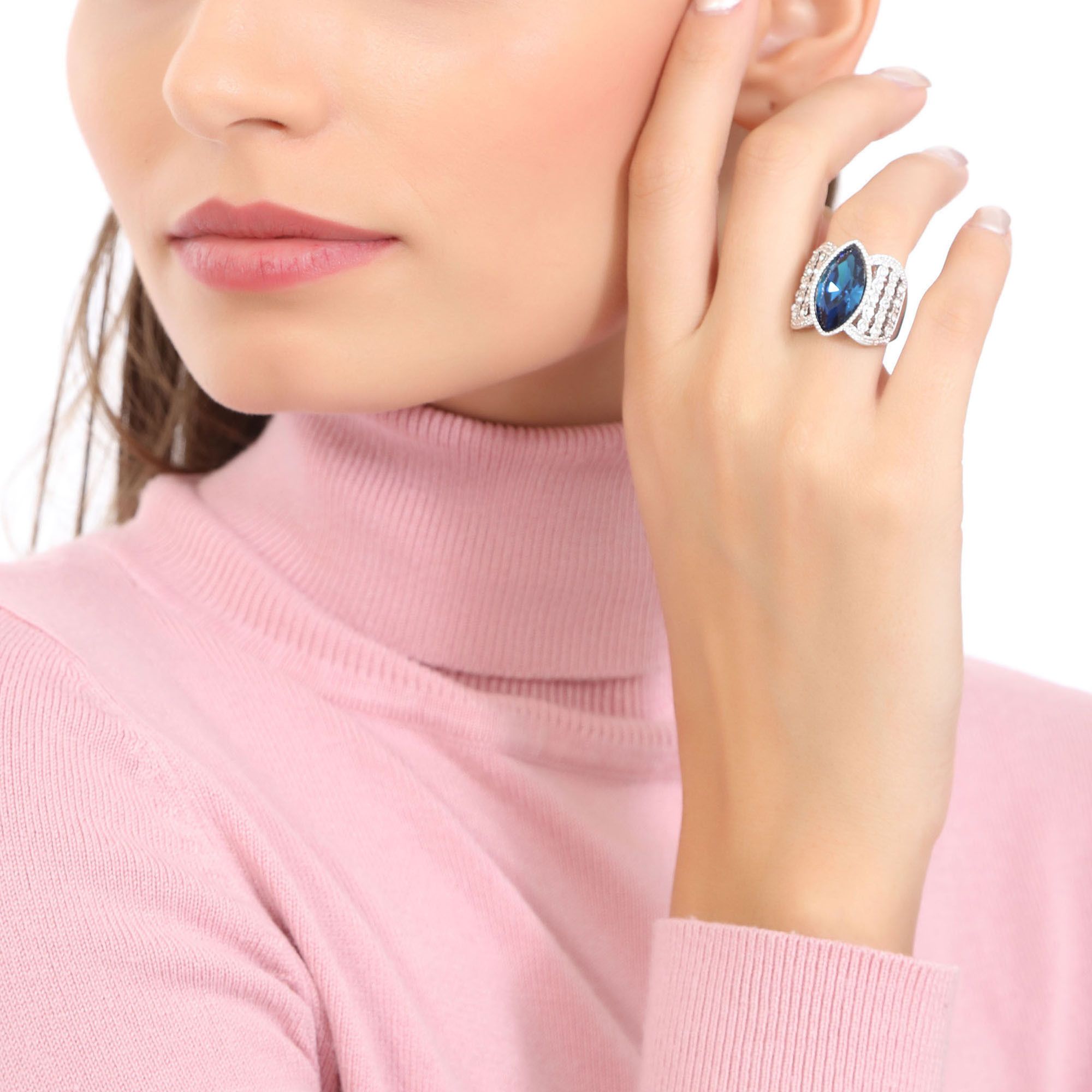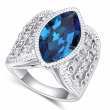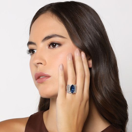 Fino anillo en baño de oro blanco de 18 quilates, hermoso diseño con cristal azul corte marquesa e incrustaciones de cristales blancos. Fabricado en una estructura de aleación de platino con rodio sin níquel.