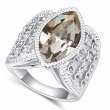 Fino anillo, en baño de oro blanco de 18 quilates, hermoso diseño, con cristal tabaco corte marquesa e incrustaciones de cristales blancos. Fabricado en una estructura de aleación de platino con rodio sin níquel.