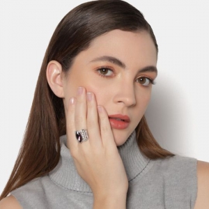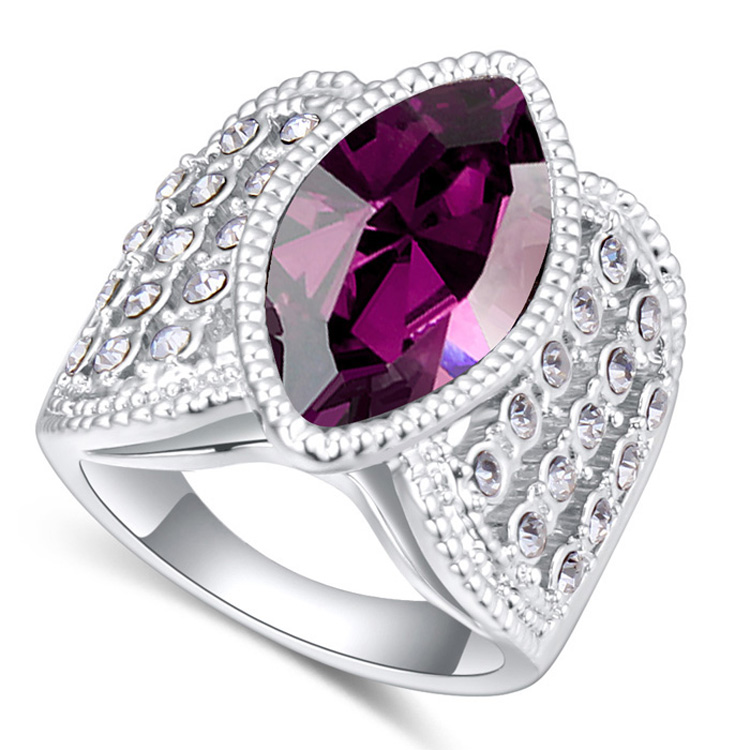 Fino anillo en baño de oro blanco de 18 quilates, hermoso diseño,con cristal violeta corte marquesa e incrustaciones de cristales blancos. Fabricado en una estructura de aleación de platino con rodio sin níquel.