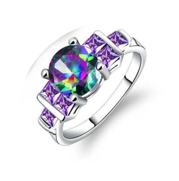 Elegante anillo, en baño de oro blanco de 18 quilates, bello diseño con cristal aurora boreal corte brillante y cristales morados corte princesa. Fabricado en una estructura de aleación de platino con rodio sin níquel.