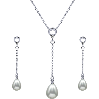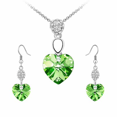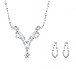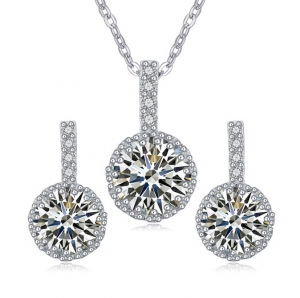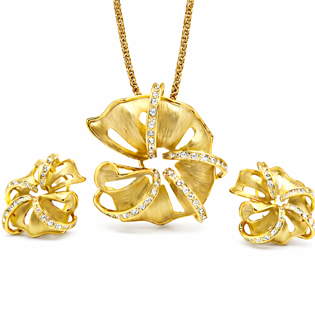 Bello conjunto de aretes y dije con cadena en baño de oro amarillo de 18 quilates, diseño original con incrustaciones de cristales blancos. Fabricado en una estructura de aleación de platino con rodio sin níquel.