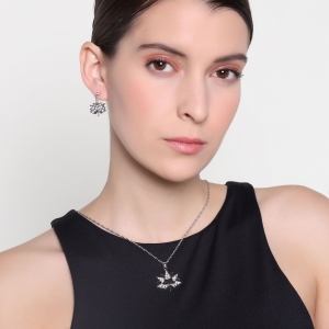 Lindo juego de aretes y dije con cadena en baño de oro blanco de 18 quilates, diseño de hoja de maple con incrustraciónes de cristales en color blanco. Fabricado en una estructura de aleación de platino con rodio sin níquel.
