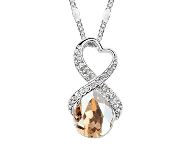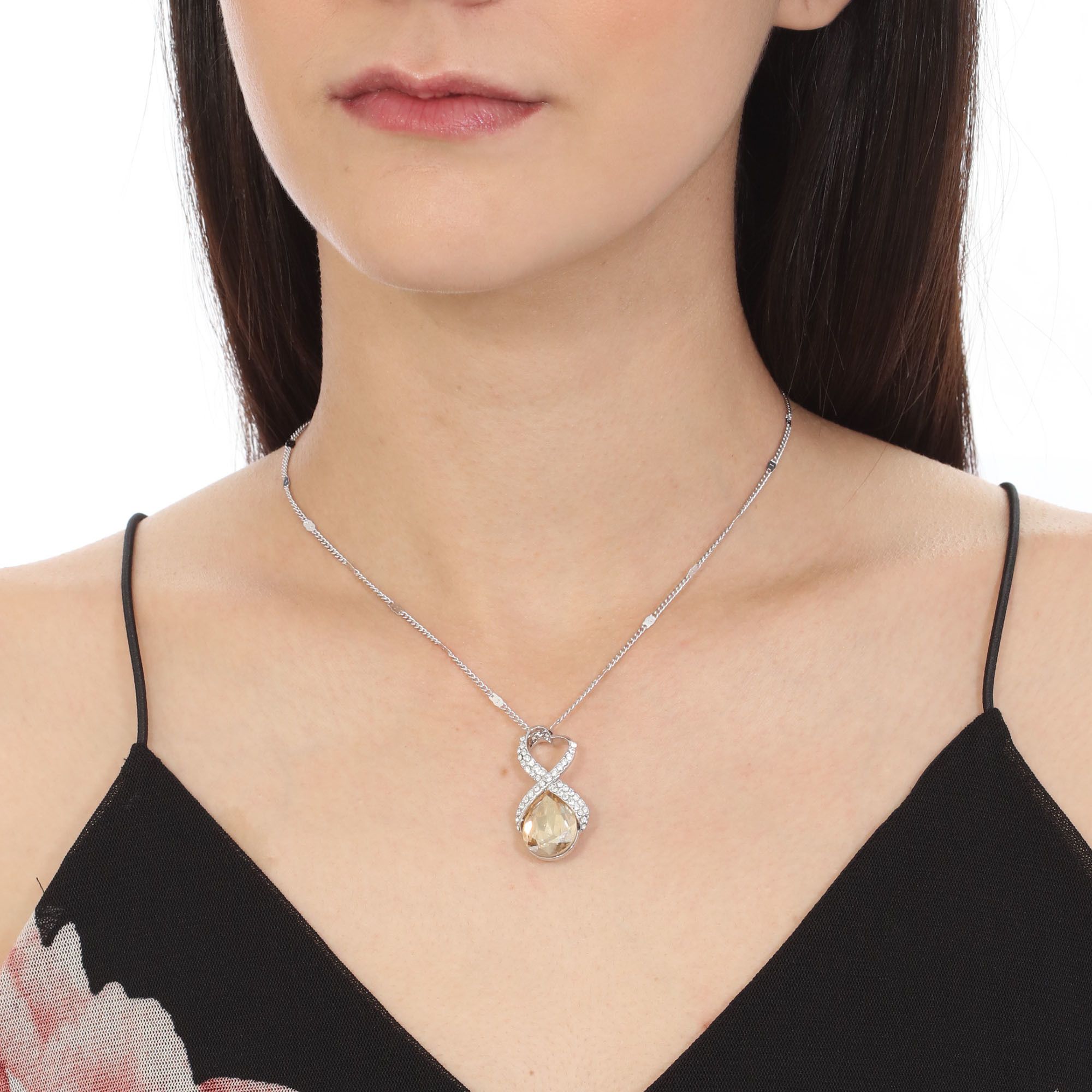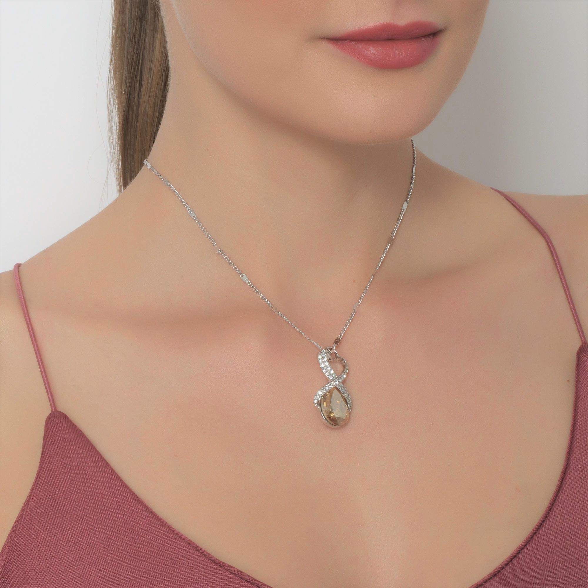 Dije con cadena en baño de oro blanco de 18 quilates, diseño de corazón con incrustaciones de cristales en color ámbar y blanco. Fabricado en una estructura de aleación de platino con rodio sin níquel.