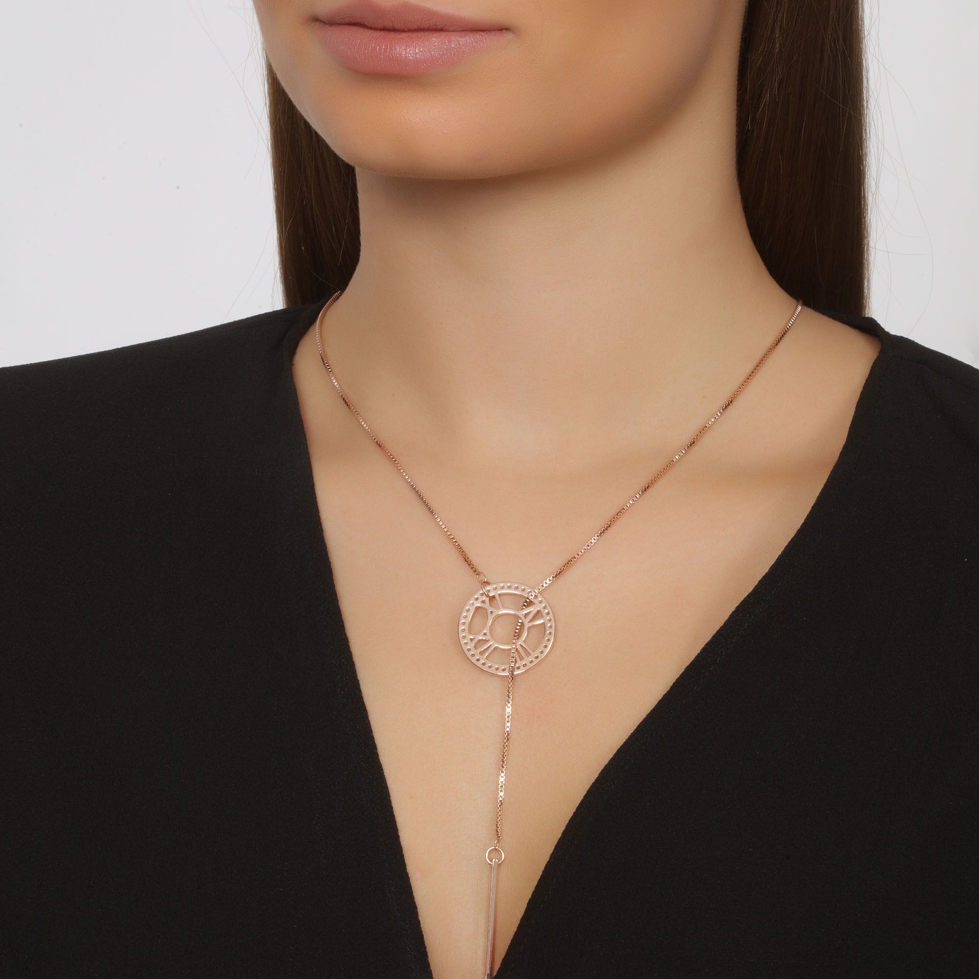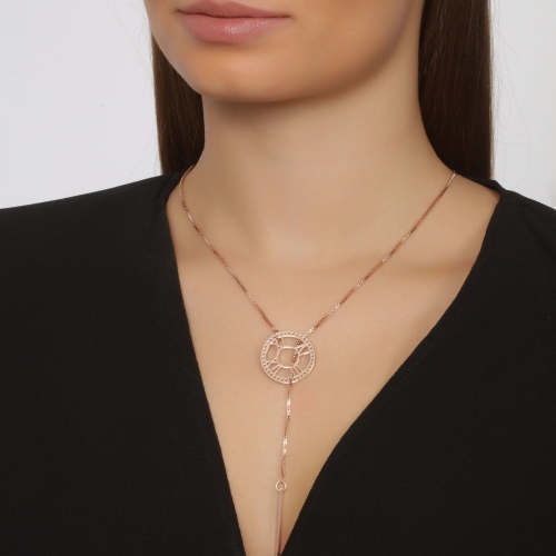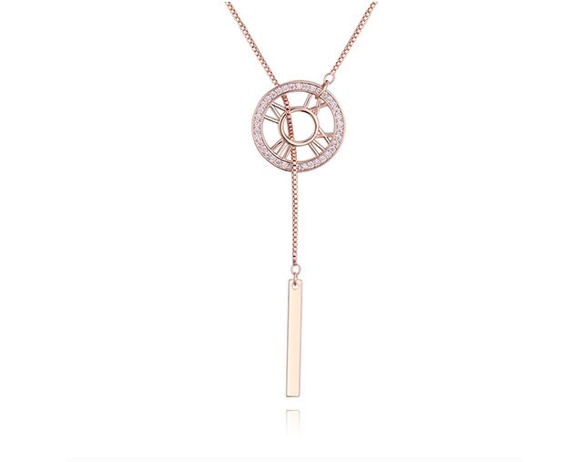 Original collar en baño de oro rosa de 18 quilates, diseño de circulo con numeros romanos e incrustraciones de cristales en color blanco. Fabricado en una estructura de aleación de platino con rodio sin níquel.